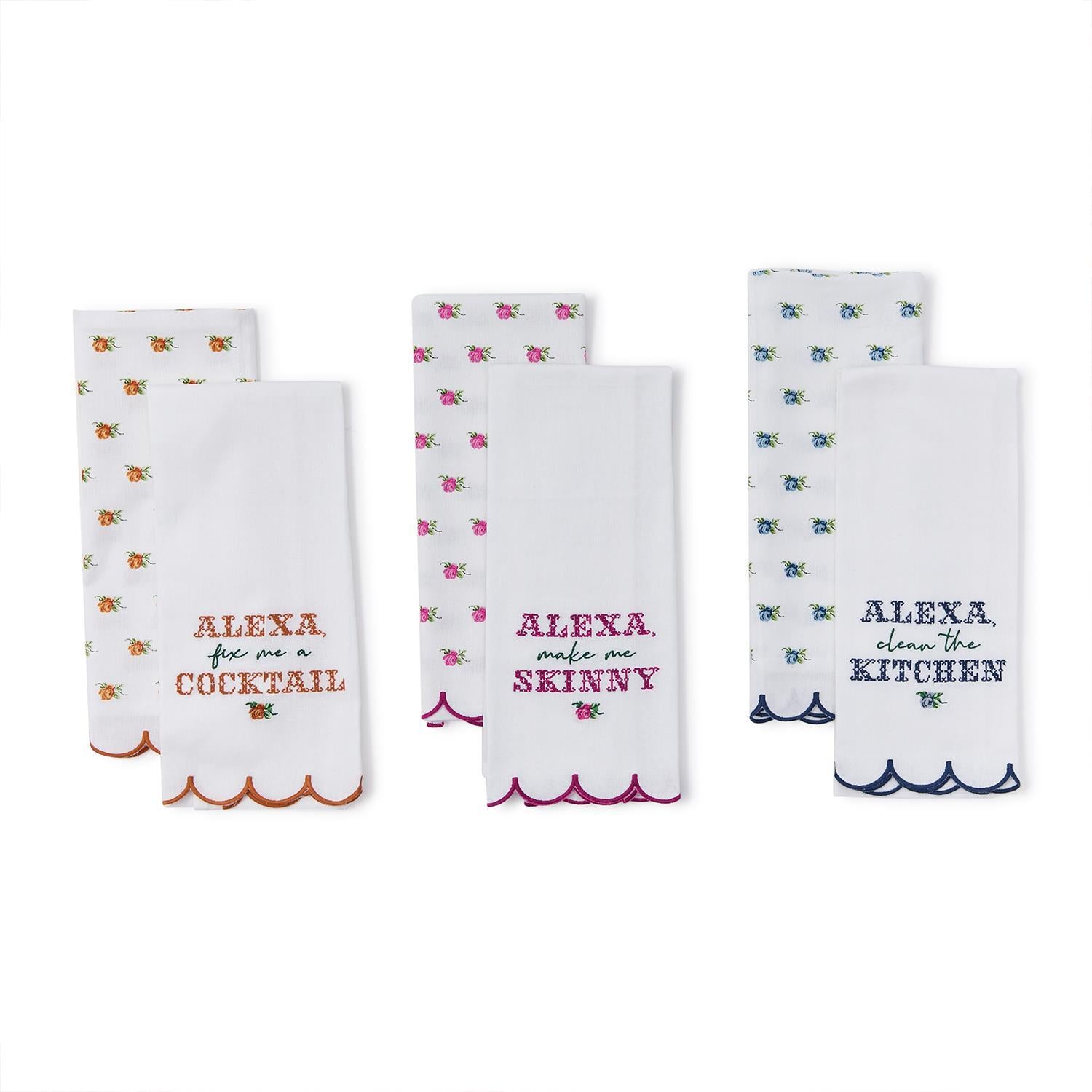 Alexa, are you listening? Alexa Kitchen Dish Towel designed by Boyar Gifts NYC feature three assorted designs and sayings: "Make Me Skinny," "Fix Me a Cocktail," and "Clean the Kitchen." Perfect for adding a touch of whimsy to your culinary space, these towels are both functional and stylish. Ideal for drying dishes, hands, or simply hanging on display, these versatile accessories are a must-have for any home chef.