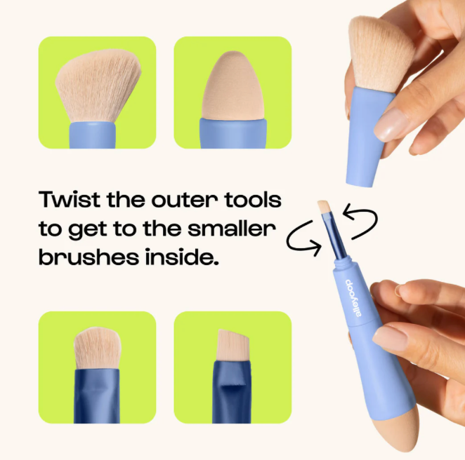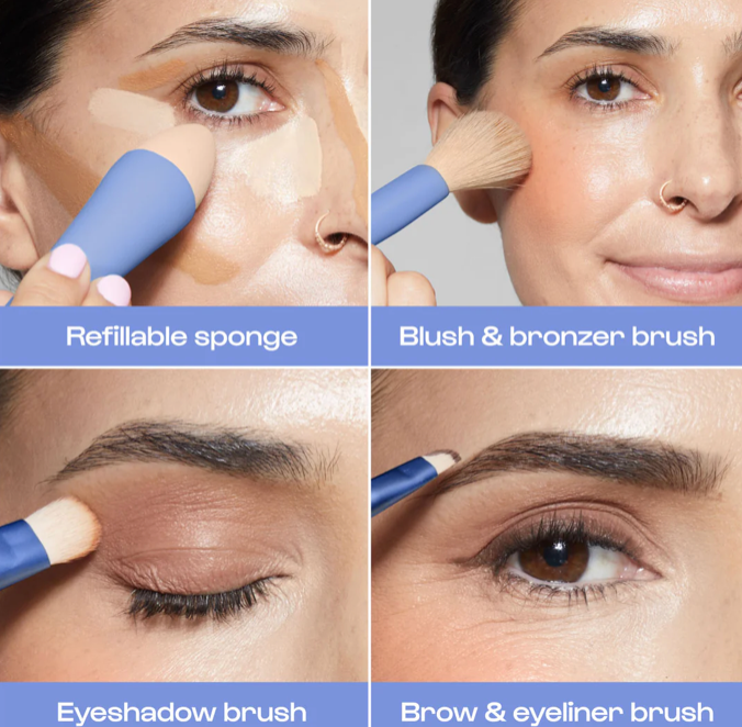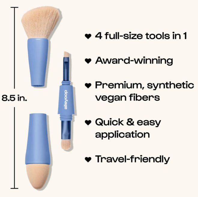 What is it? This Allure award-winning 4-in-1 makeup brush packs all your essential beauty applicators in one easy tool: Blush & Bronzer Brush, Blending Sponge (replaceable), Brow & Eyeliner Brush, and All-Over Eyeshadow Brush. Sweep, blend, blur, and line to your heart's content with this ultra-compact, travel-friendly MVP.