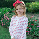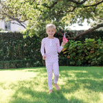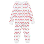 Pima cotton long sleeved pajama top and pant set. Pants have an elastic waistband and the long sleeved top has a placket featuring 3 functional buttons. Made from 100% Peruvian Cotton. For child's safety, garment should fit snugly.