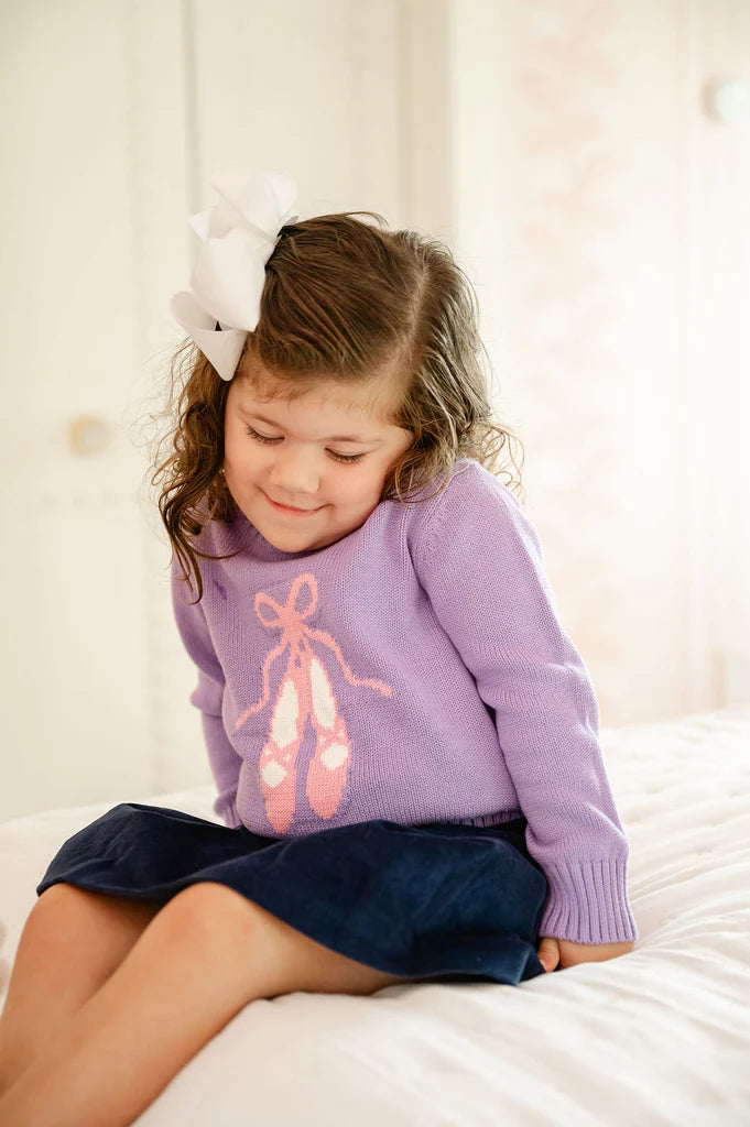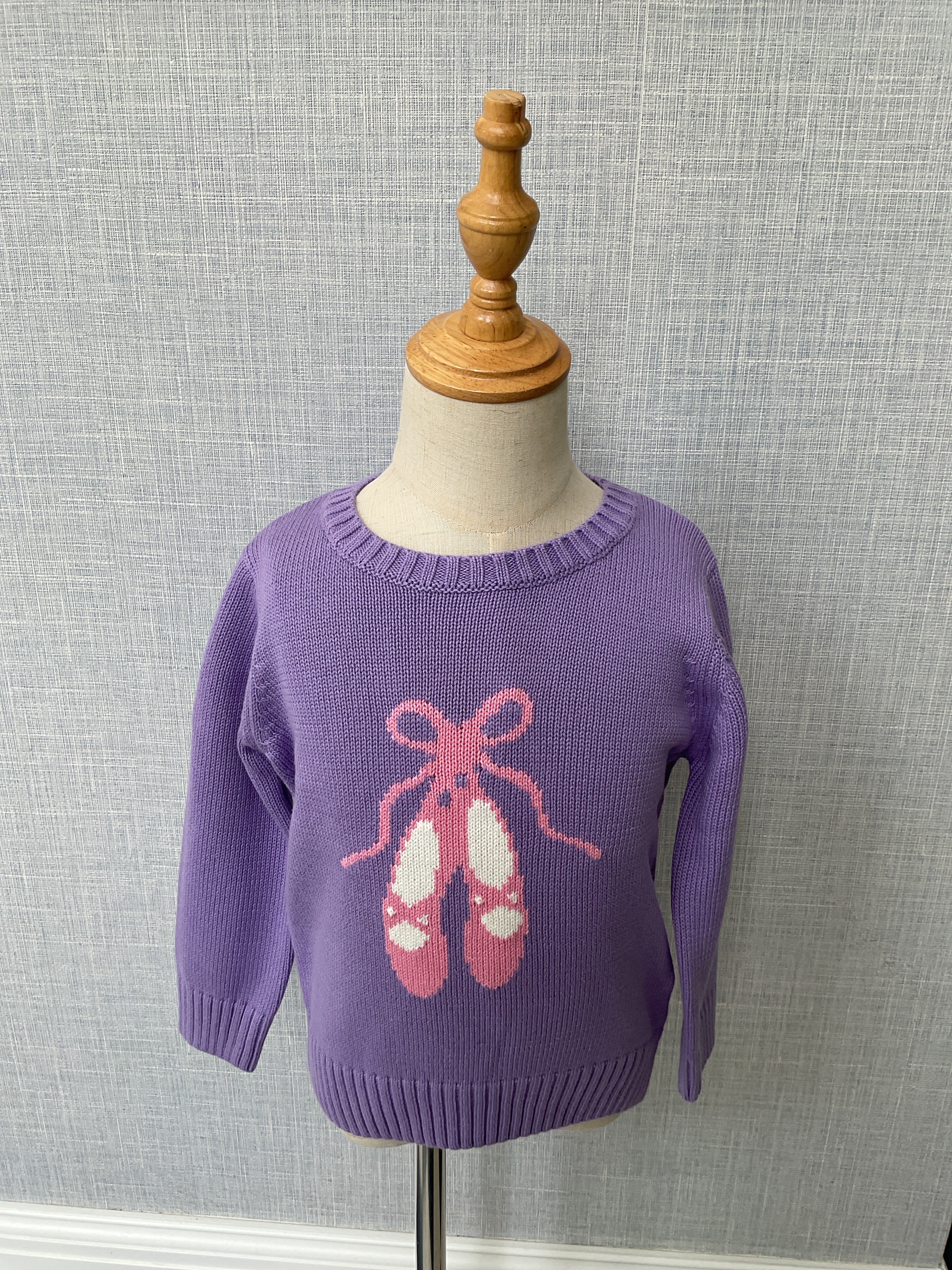 For the little ballerina in your life, our Purple Ballet Sweater is a graceful and cozy addition to her wardrobe. This soft knit cotton sweater features a charming pair of pink ballet shoes, making it a perfect piece for layering in the fall, wearing over a leotard for dance class, or for any special event.