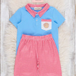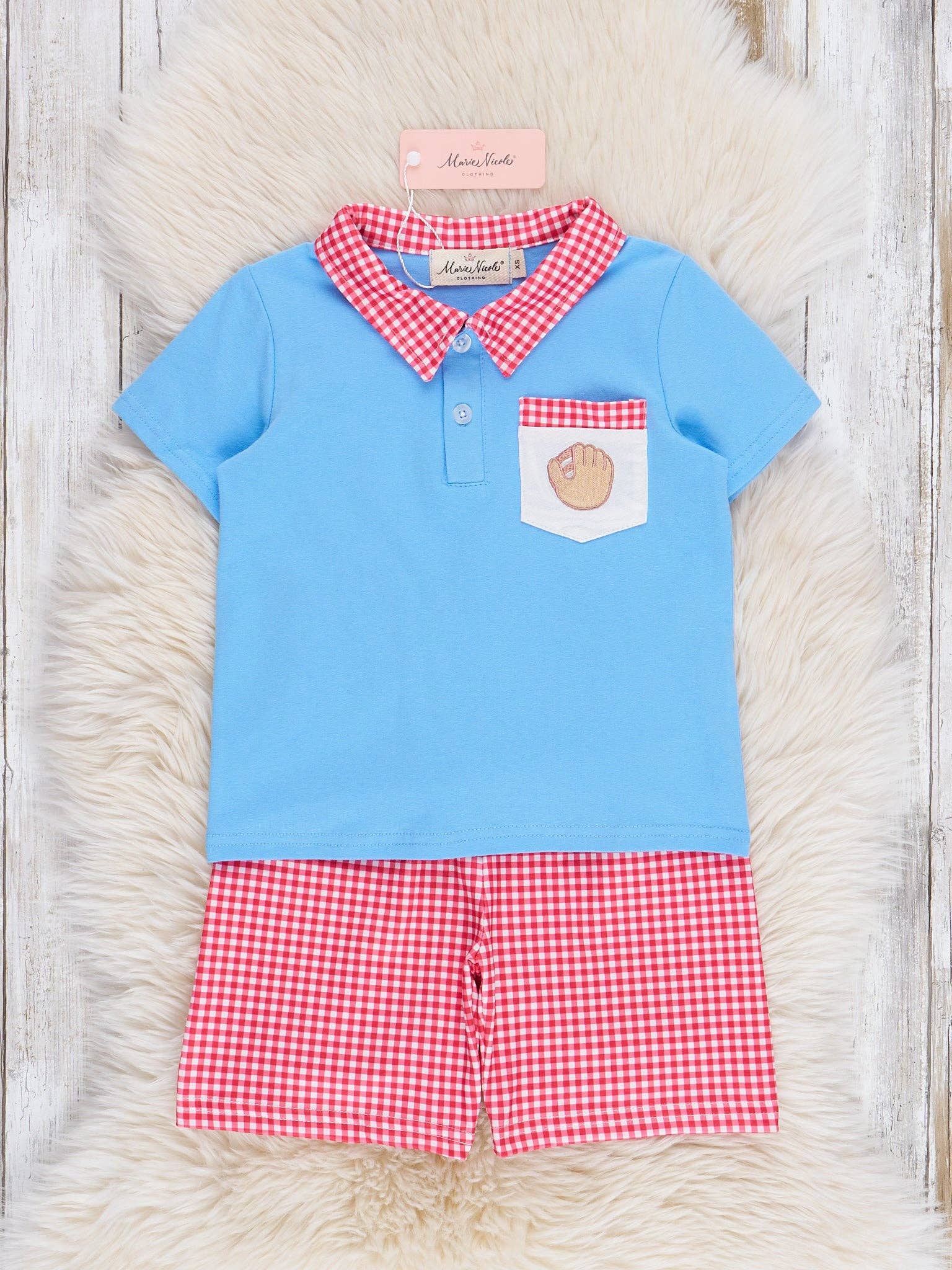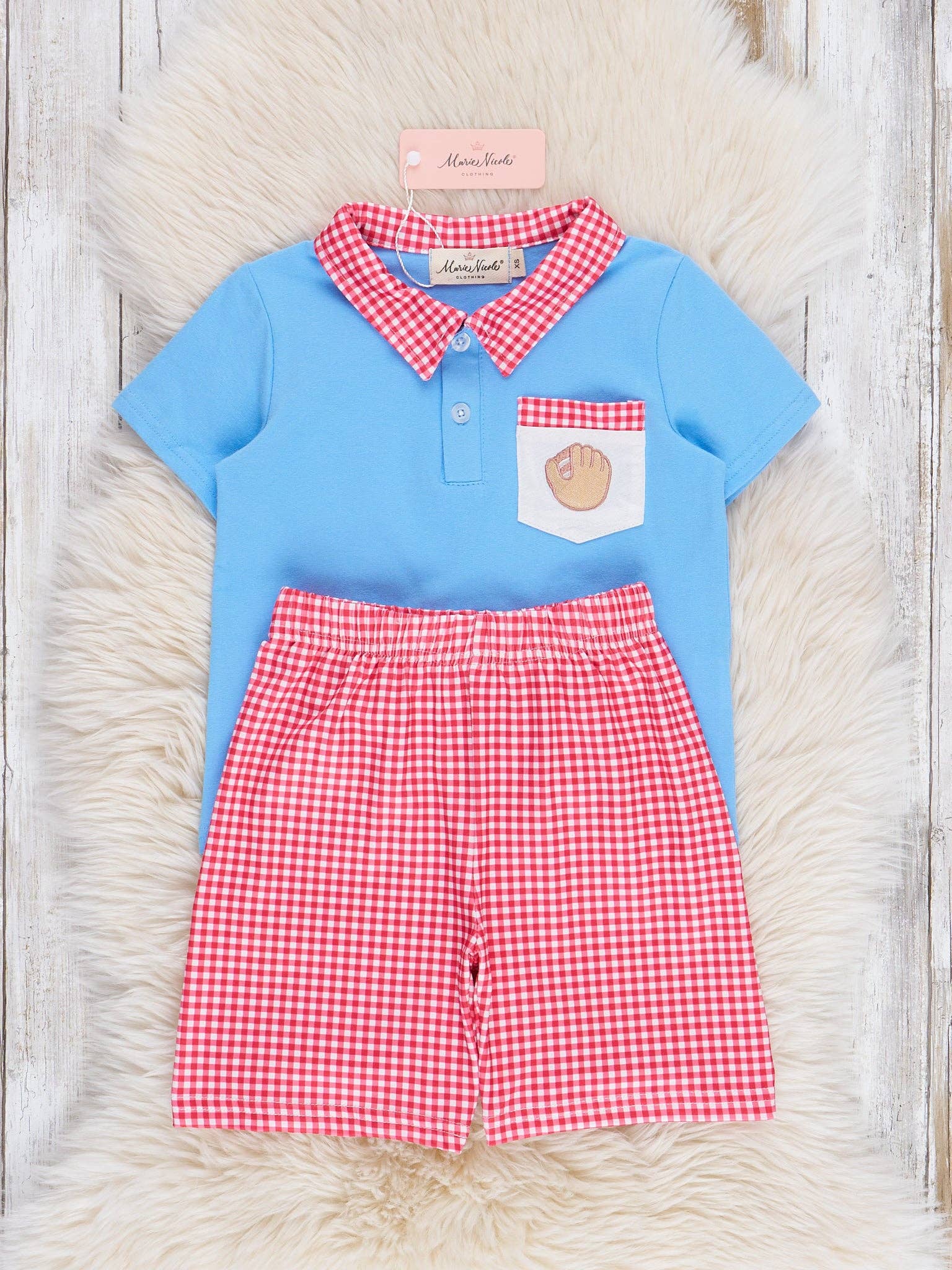 Get ready to hit a home run with this adorable Baseball Gingham Embroidered Pocket Outfit by Marie Nicole Clothing! Made with soft cotton, the blue top features an embroidered baseball at the pocket, while the red gingham collar completes the look with matching shorts. A playful and stylish choice for any siblings. * Fits true to size. * Top: 97% Cotton / 3% Spandex * Combo: 95% Polyester / 5% Spandex * Bottoms: 95% Polyester / 5% Spandex *