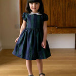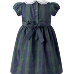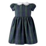 Charming Blackwatch Dress features a delightful plaid pattern in dark navy and green. Perfect for little adventures! Playful puff sleeves, ivory Peter Pan collar, trimmed with navy piping and dedicated lace, brings a classic charm!