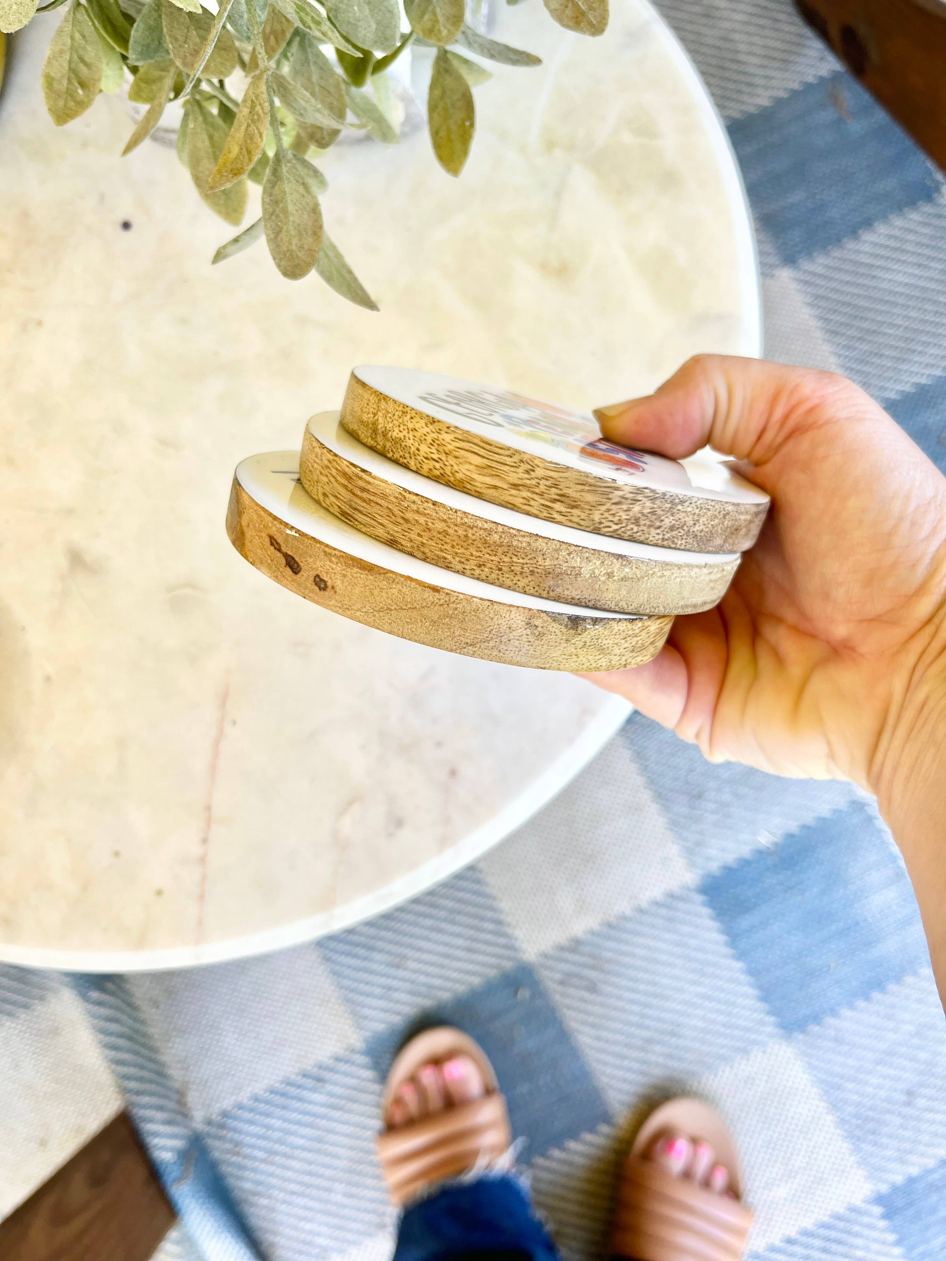 Measures 4". Each ornament showcases original hand painted artwork . Wood and Enamel.