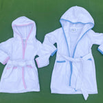 Our new hoodie robes are a must have this summer! They are perfect for the bath, pool, or beach. Adorable with or without a monogram and come in 3 functional sizes as follows