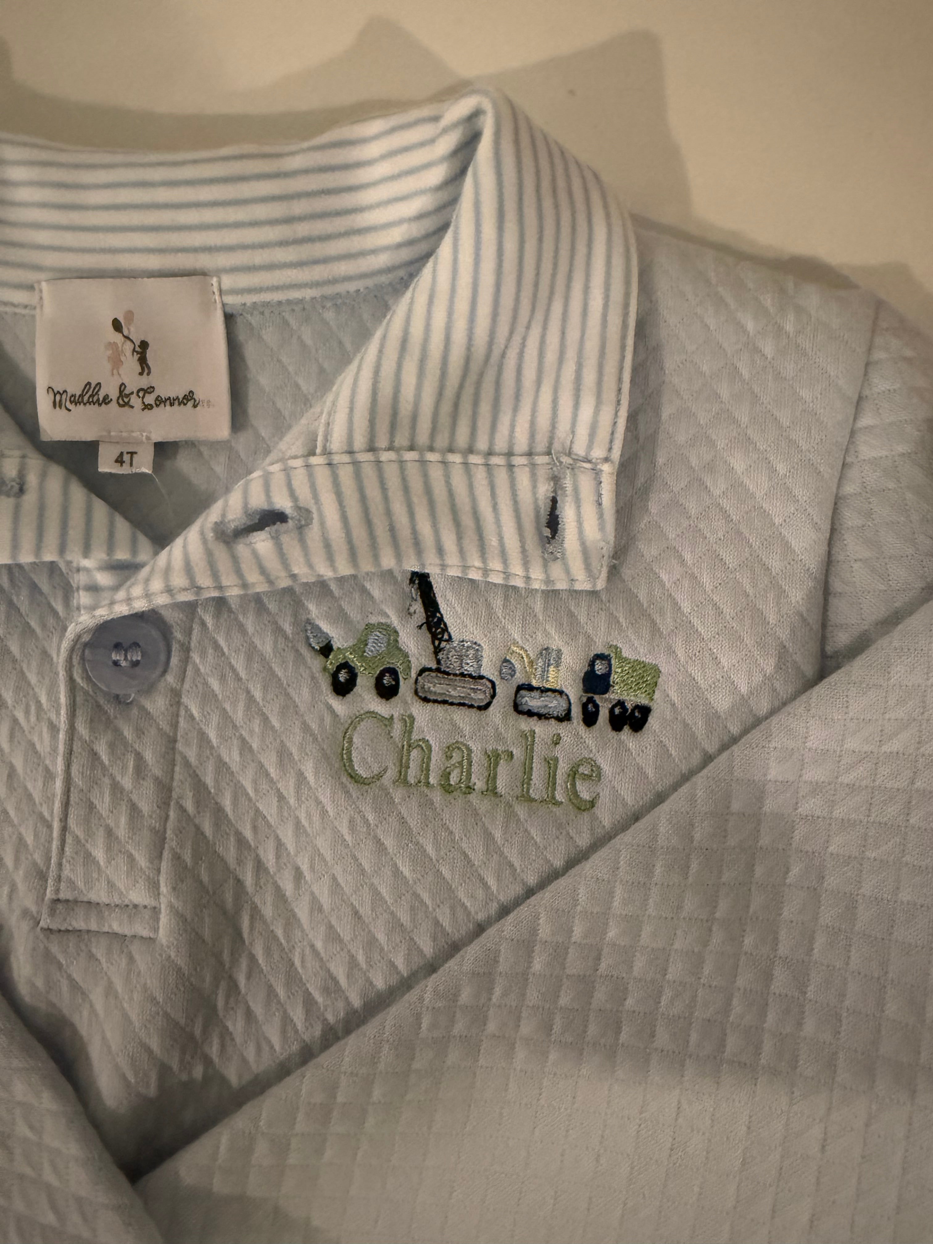 Our Benjamin blue pullover features our luxurious quilted pima cotton with blue and white stripe lining in collar. It will be a staple in his closet! Fit is tts.