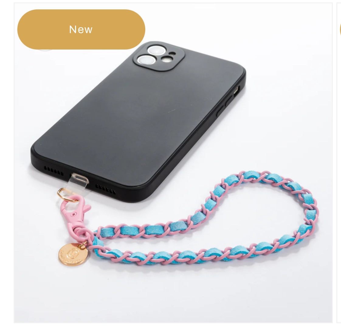 Miami Chains & Co Phone Wristlet, featuring matte pink plated chain with 100% light blue suede worn throughout. Turn your phone into a wearable accessory that keeps you hands free...think of it as a bracelet for your cell phone!