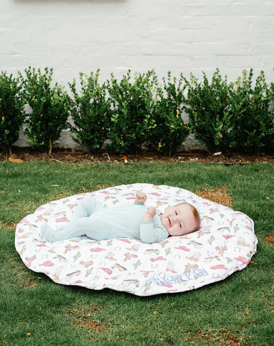 Ideal for playtime, tummy time, downtime, and family time, The Play Mat was built with new parents and their little ones in mind. Our lightweight design makes it easy to move around the home or pack up for a play space on-the-go. Each design was thoughtfully created and hand-painted before being made into fabric that is washable and functional for your busy family.