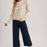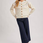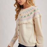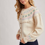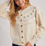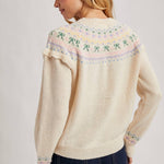 This is a charming button-front cardigan, crafted from a soft, creamy white and grey knit. Its standout feature is a traditional Fair Isle yoke, decorated with a whimsical pattern of bows and geometric designs in soft pastel shades of pink, lavender, yellow, and green. A delicate, scalloped knit ruffle frames the yoke, adding a sweet, vintage-inspired touch. The sweater is finished with contrasting brown tortoiseshell buttons, a classic crew neckline, and ribbed cuffs that echo the colorful Fair Isle motif, creating a cohesive and beautifully detailed piece.
