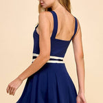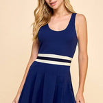 Scoop neckline athletic dress with a pleated skirt and a striped detail on waistline.