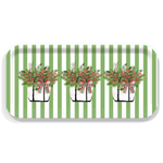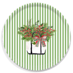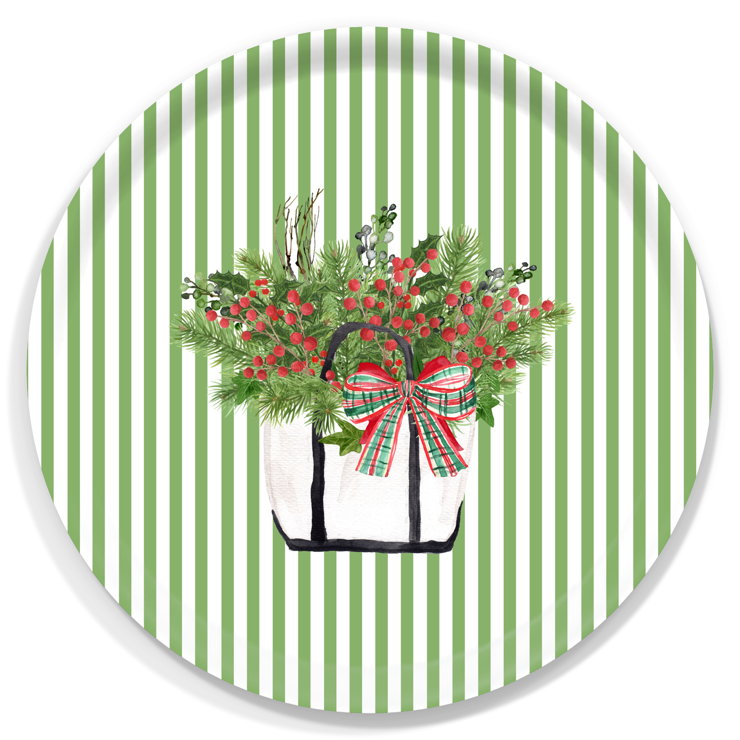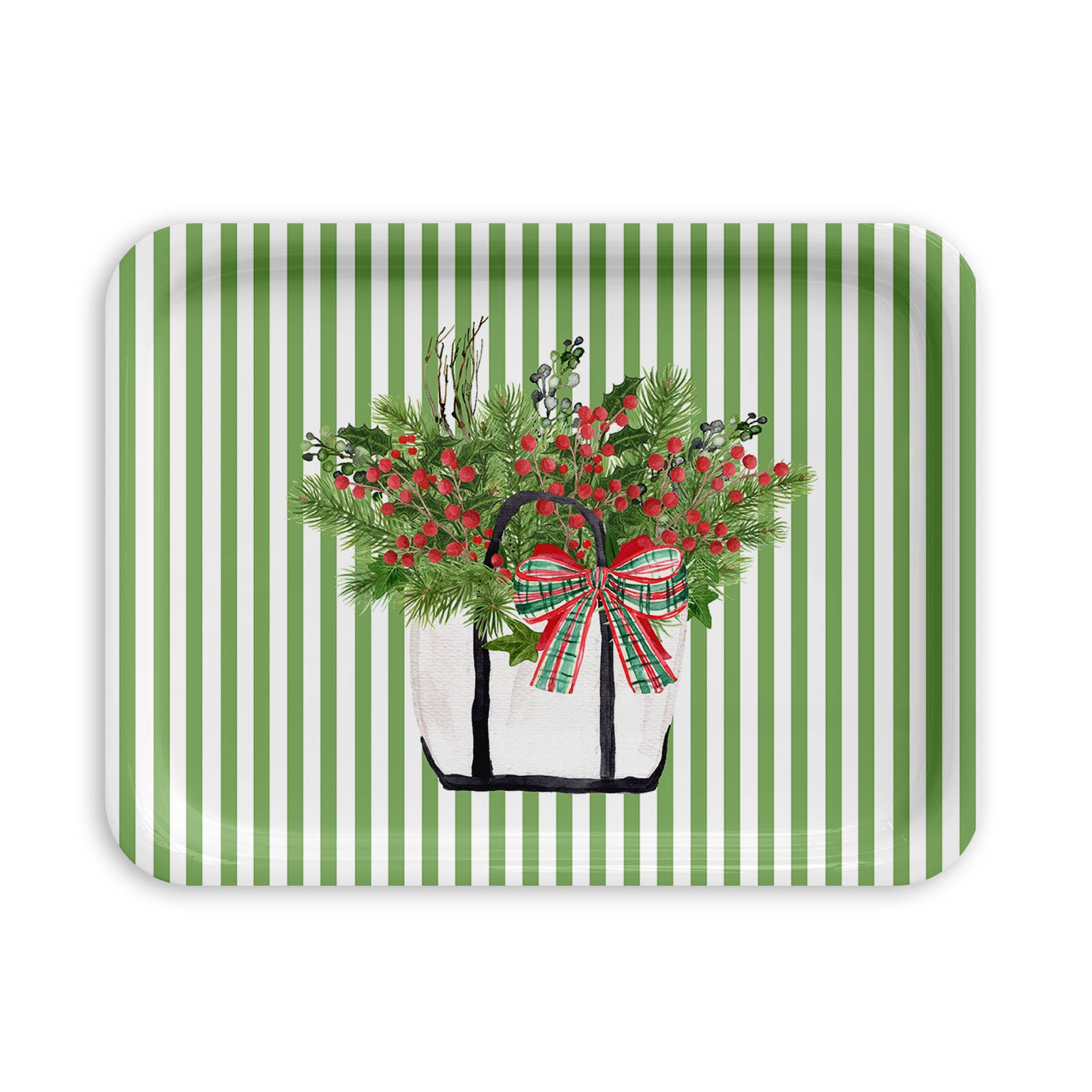 Bring festive cheer and preppy charm to your holiday table with the Christmas Tote Tray. Featuring a beloved canvas tote brimming with seasonal greenery, berries, and a plaid ribbon, all set on bold green stripes—this tray is a perfect blend of New England charm and Christmas spirit. Handcrafted in Finland from birch wood sourced from Certified Sustainable Forests, each tray is sealed with a transparent layer to protect the wood. ● Sizes: Large: 16.5" x 12.5" Round: 16" Small: 11" x 5" ● We recommend cleaning with a damp cloth. ●
