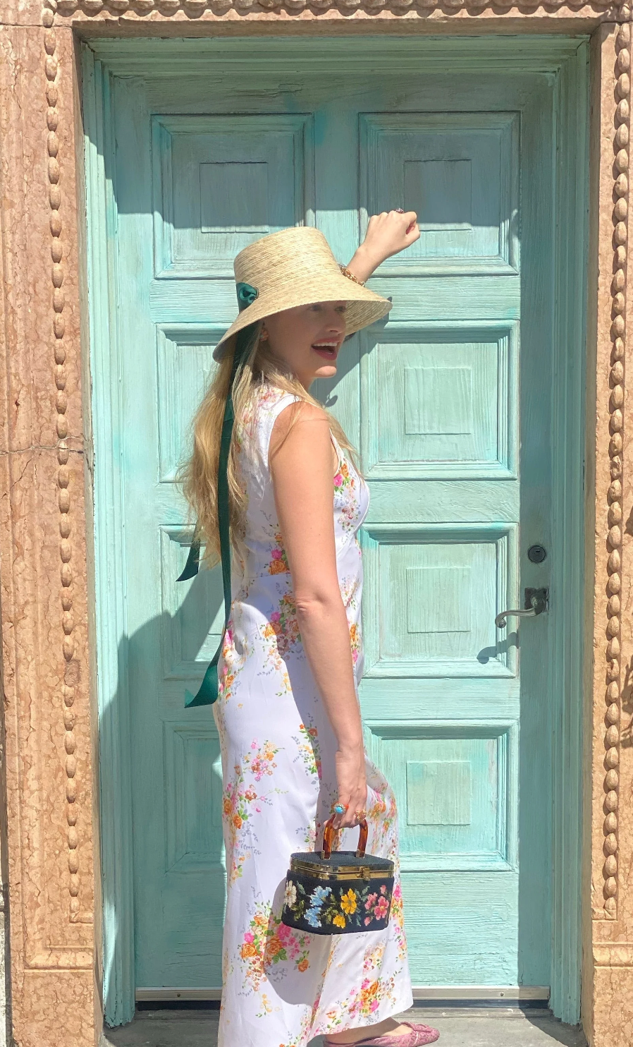 We prefer to wear the ribbon facing toward the back (as pictured on Sarah), or on top of the hat, for this style. However, you are free to get creative with your ribbon styling techniques!