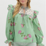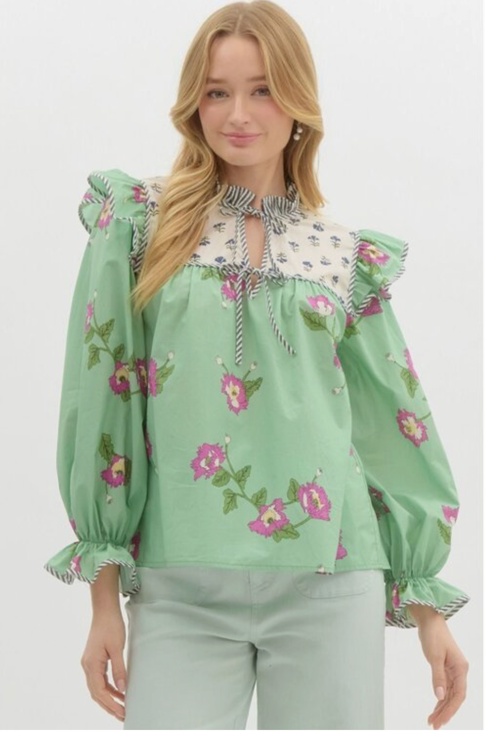 White Double Bow Top, cutest floral top! Blouse is not green it is white like the cropped picture. All green blouse is to depict style and fit.