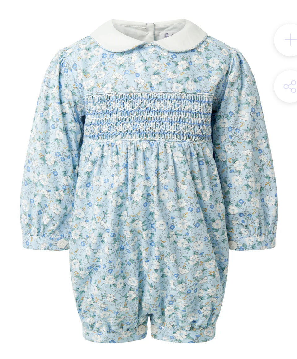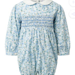 Charming floral smocked babysuit is a sweet treat for your little blossom. Featuring a delicate floral print on soft pastel blue, a cute contrasting Peter Pan collar, and a smocked front panel. Comfy and adorable! Button opening at the back makes dressing a breeze, so your tiny tot can giggle and wiggle all day!