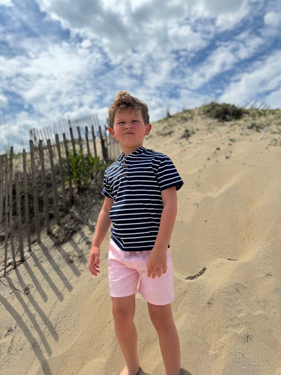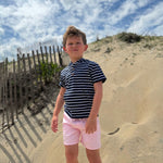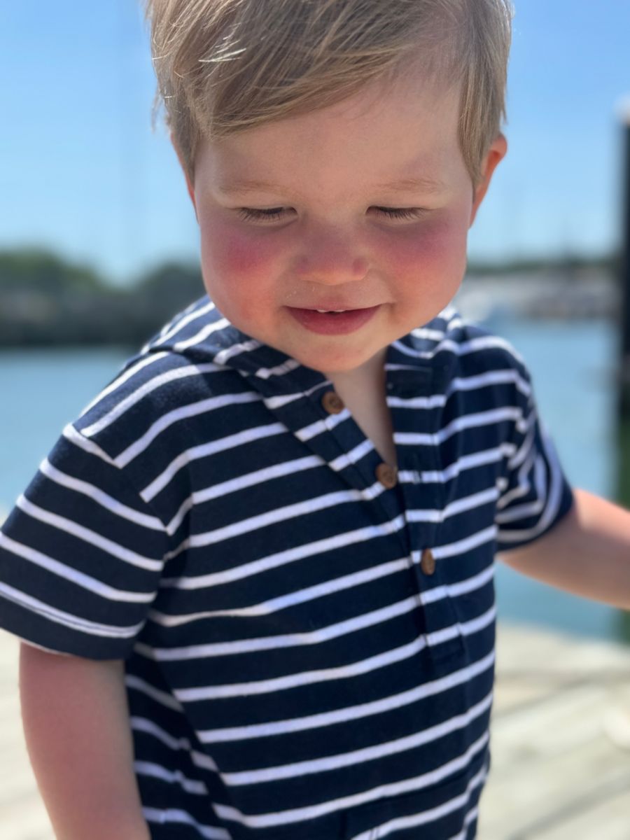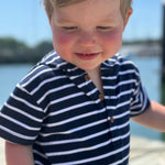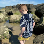 The navy and white hooded top is a fun, comfy, and stylish piece that every little guy will love!
