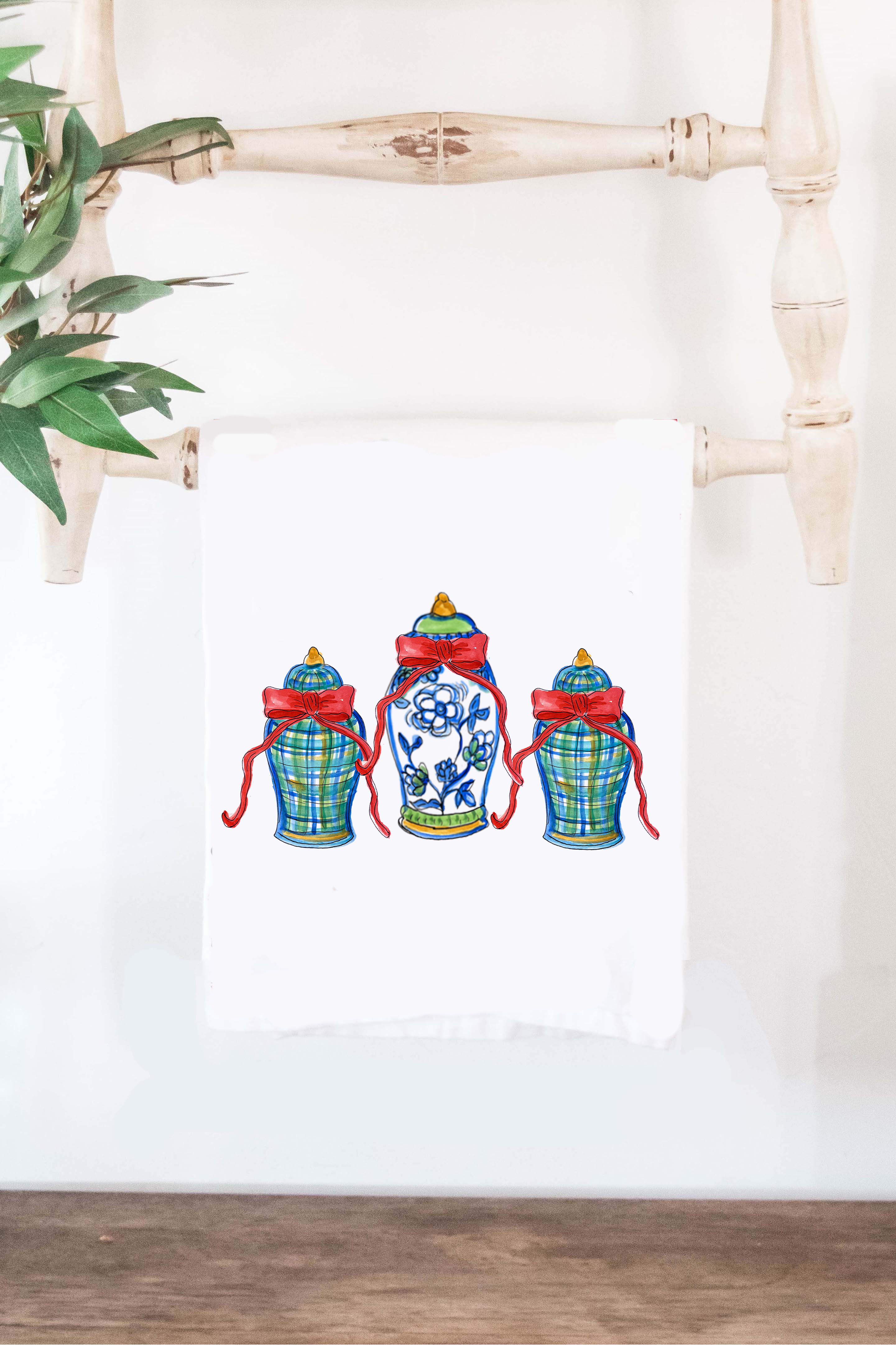 Enjoy this classic Christmas tea towel. Original hand drawn/painted artwork Christmas Cotton Tea Towel. Measures 19" x 28". Great for your holiday entertaining or as a hostess gift! Artwork by Rachel Walker.