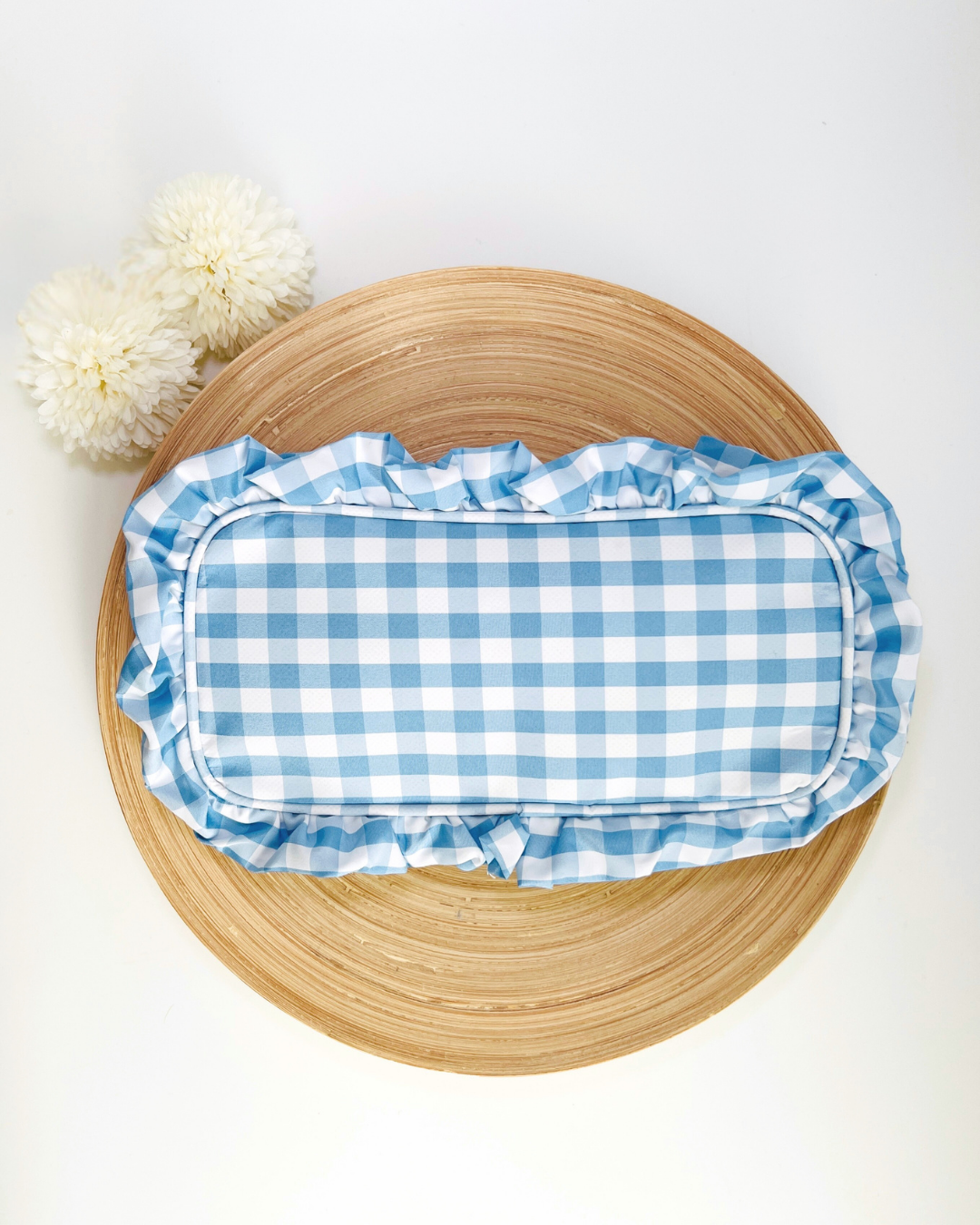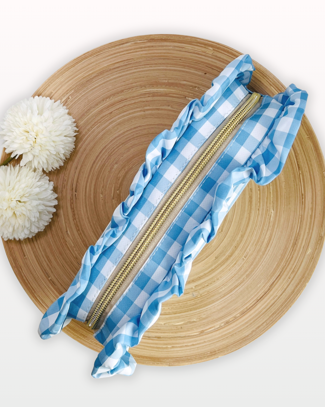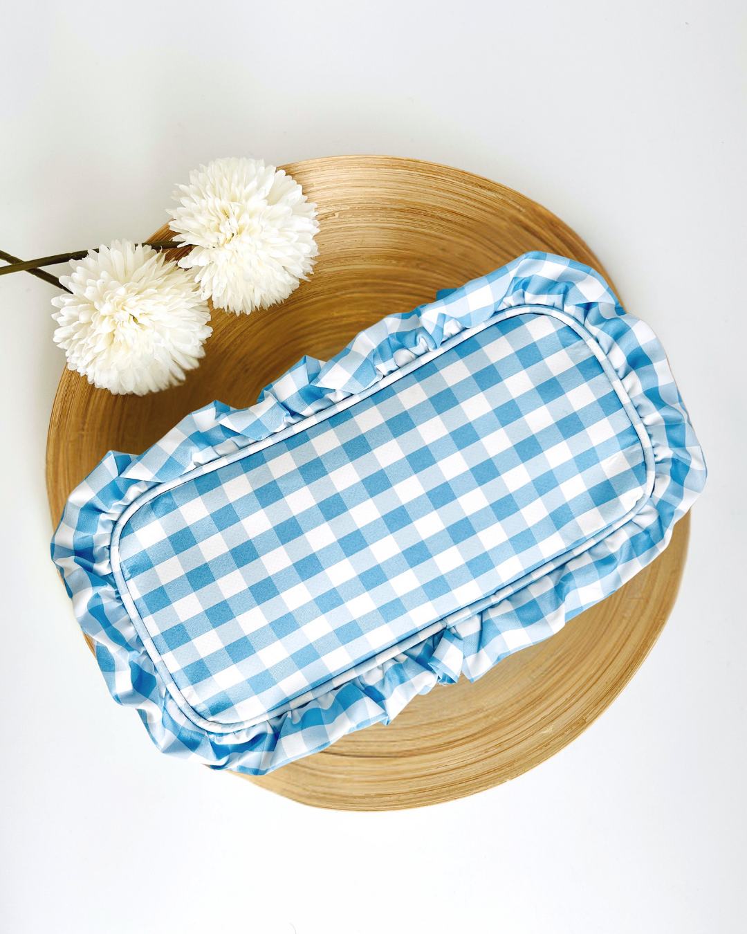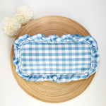 The cutest cosmetic pouch in a blue gingham print with ruffles. Makes a great travel bag, pencil pouch, or make-up pouch. It can also be used to store chargers and accessories.