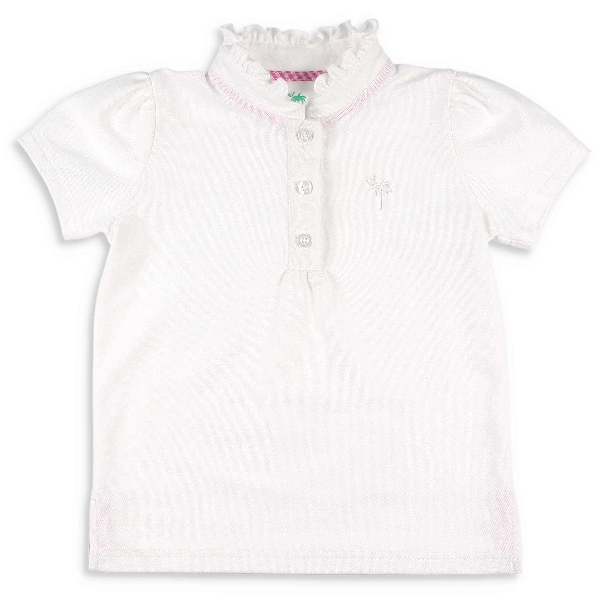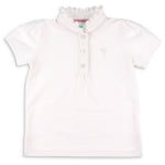 Ruffles return! Introducing our new pique ruffle collar polo tops and dresses for her back to school wardrobe! This versatile top features soft, poly/cotton blend fabric in white, a ruffle neck.