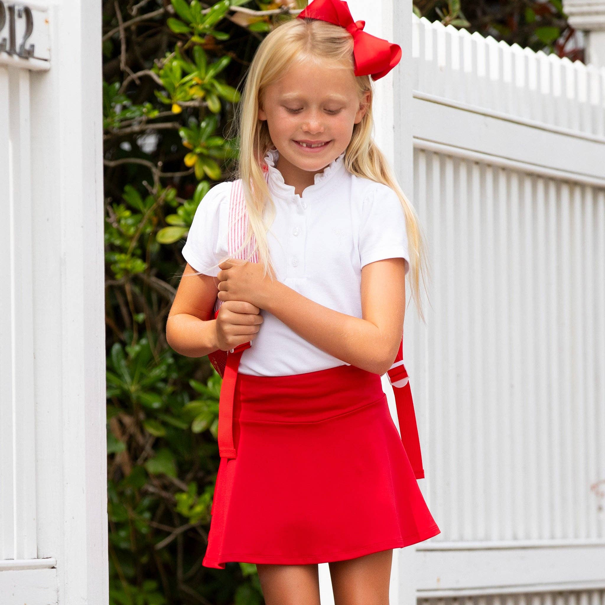 Three e custom front buttons making it perfect for pairing with shorts, skorts, skirts, or pants. Such a versatile and comfy top. This polo coordinates with many of our collections and is the ideal top to mix and match with her wardrobe. Perfect for all fun activities, and for cooling off in the late hot summer and warm fall weather! Look for our Boys Performance Polo - White for those matching sibling outfits!