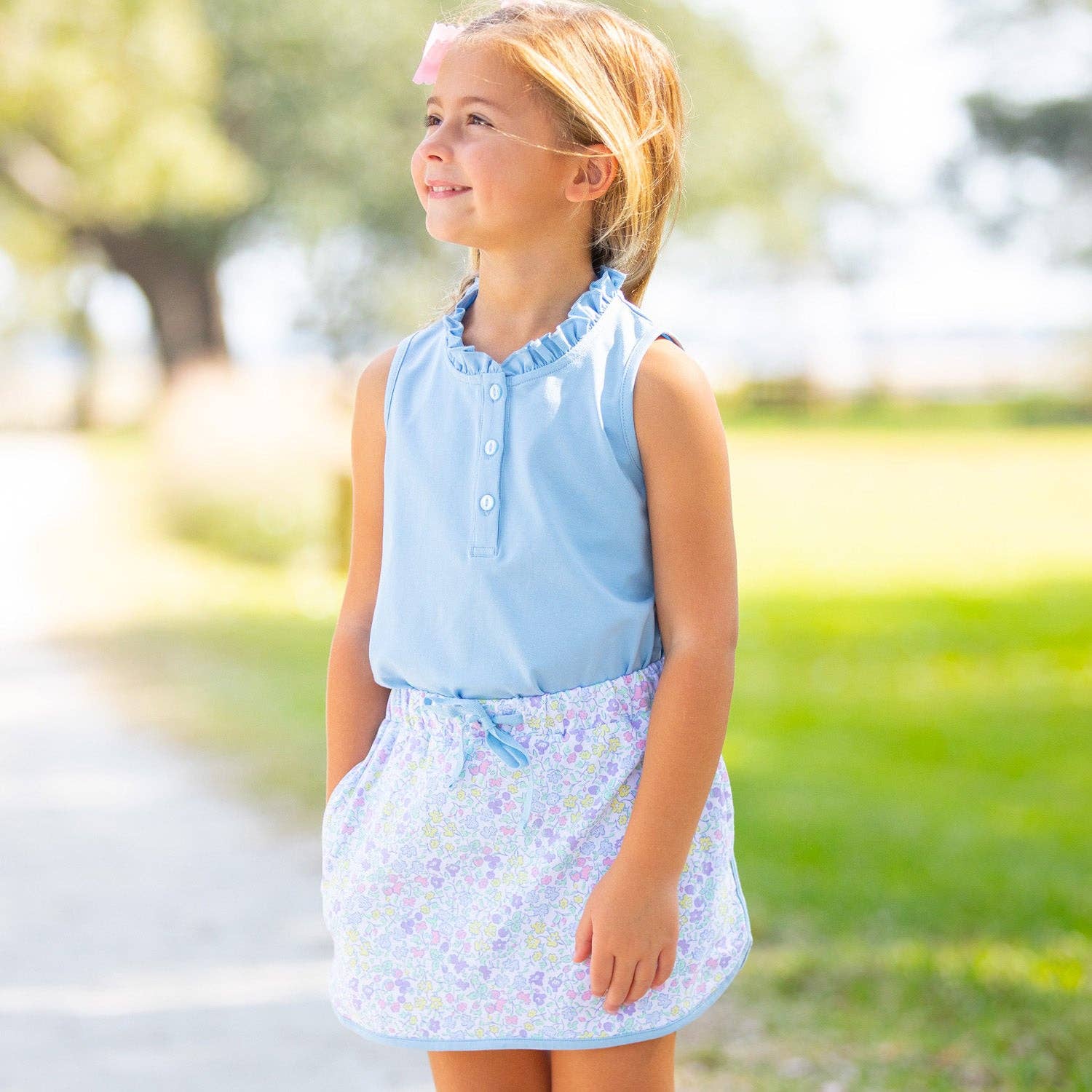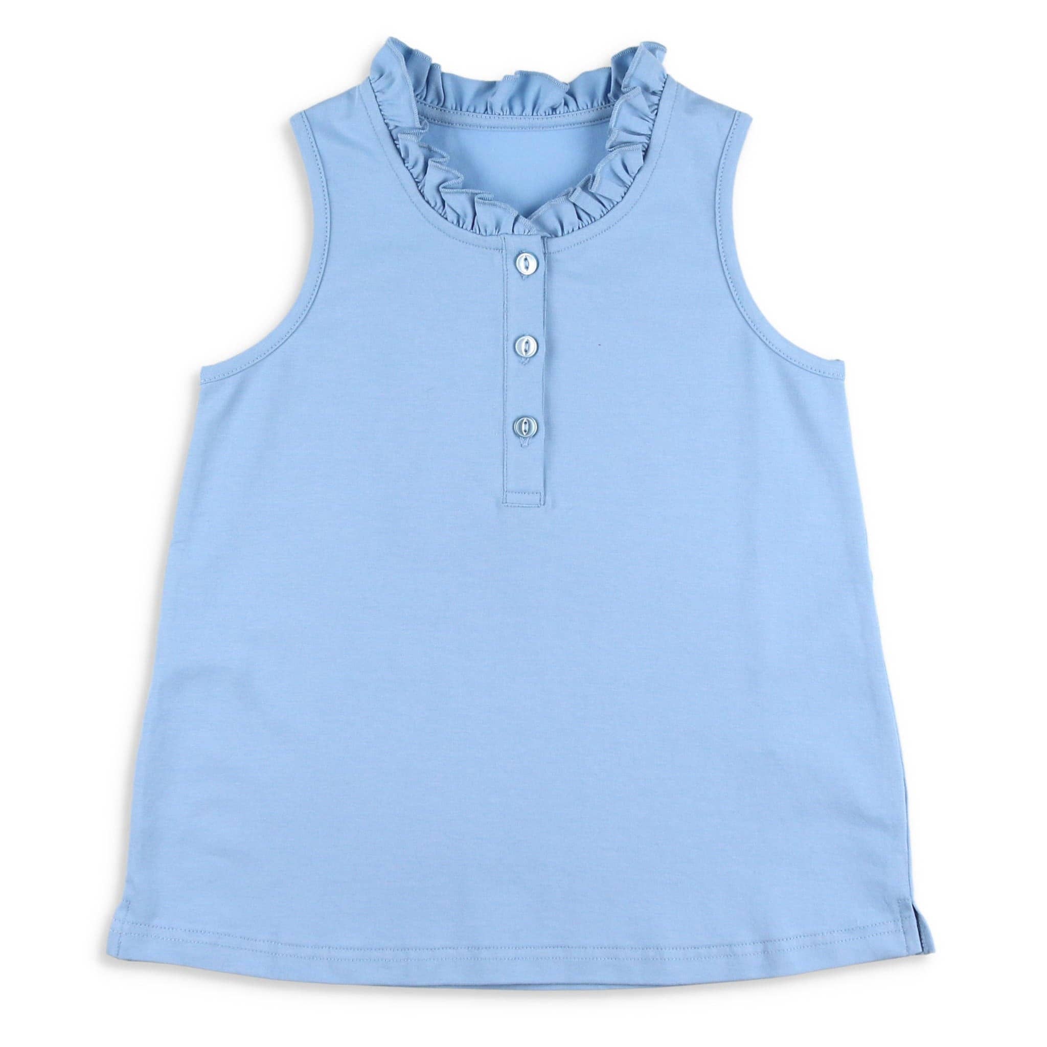 Featuring a soft cotton ocean blue knit, a ruffle neck, and three custom front buttons makes it perfect for pairing with shorts, skorts, skirts, or pants. This polo coordinates with many of our collections and is the ideal top to mix and match with her wardrobe. And with our Coconut Grove and Alys Beach collections, the matching sibling outfits will make a great photo opp!