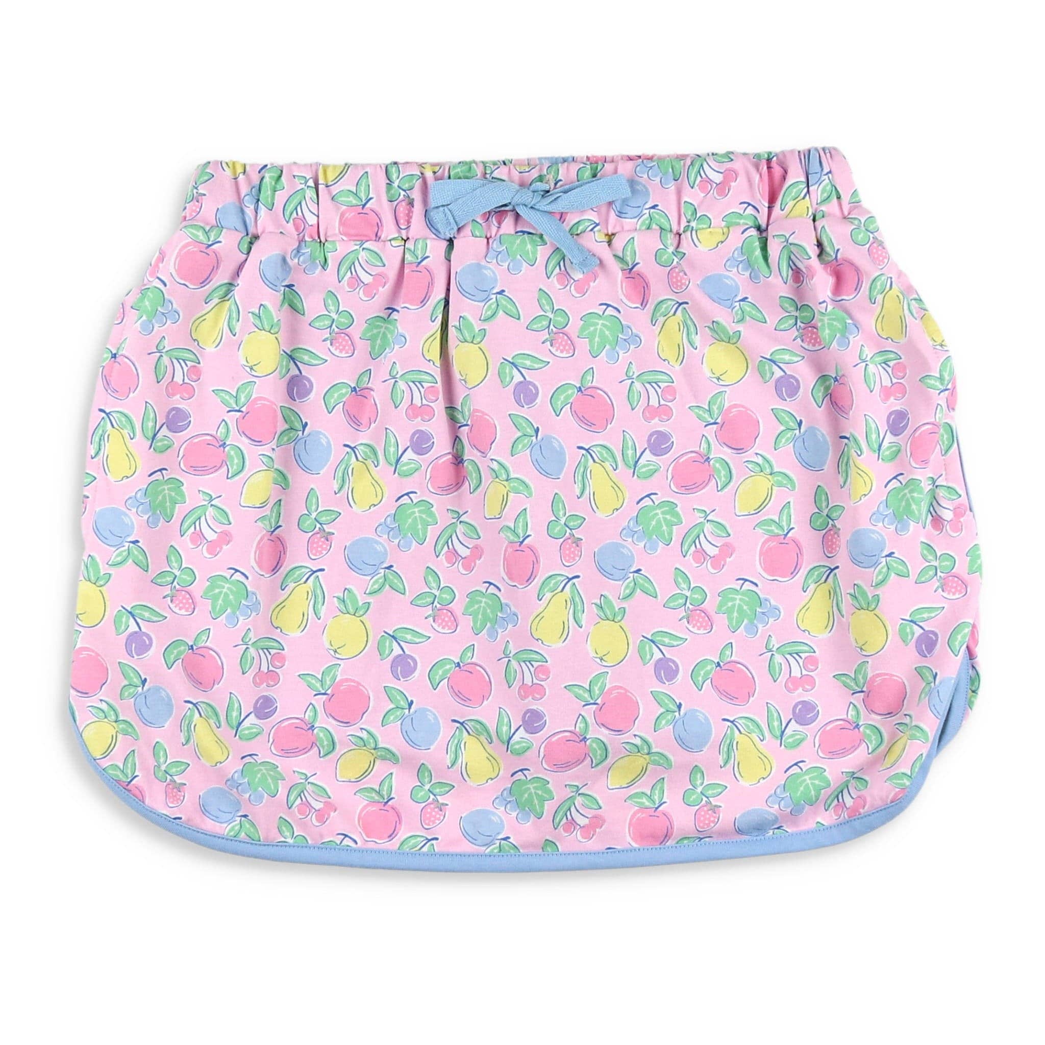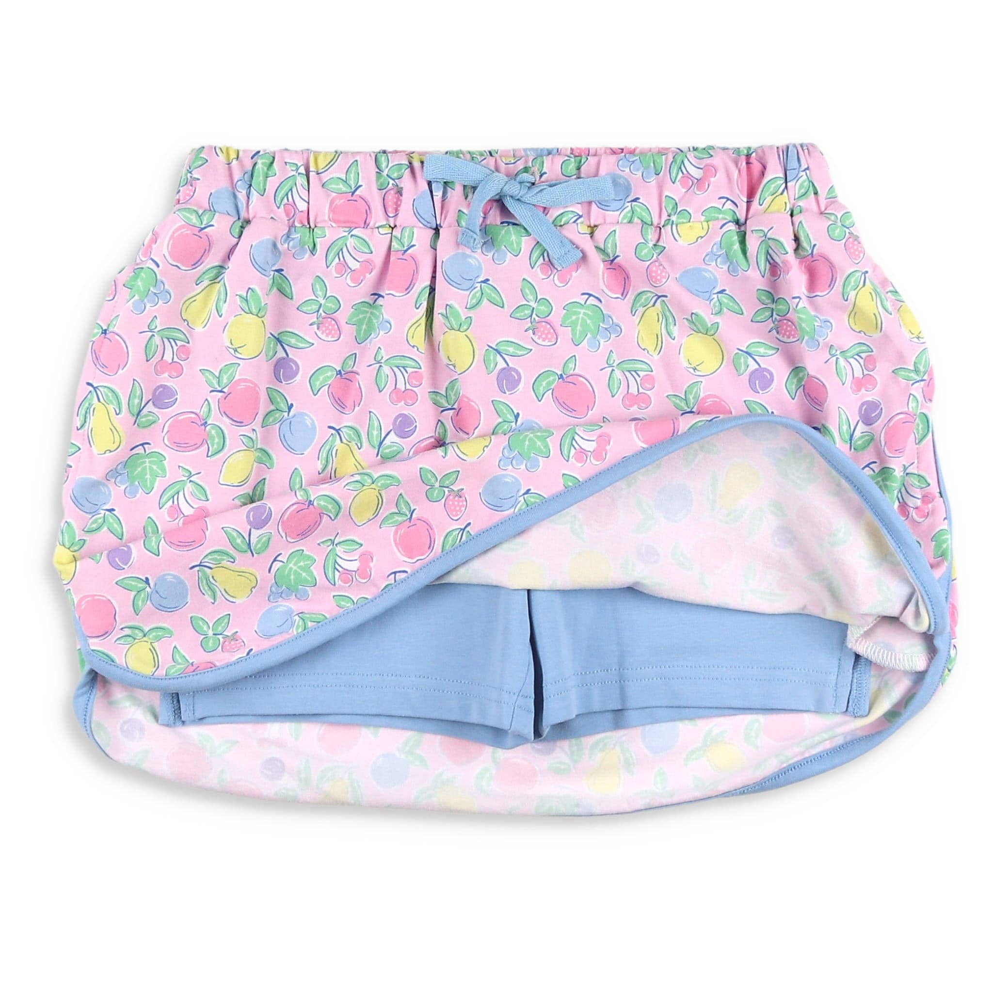 Pairs great with a polo or sweater! Like the colorful and fruity foliage in a coconut grove, who wouldn't fall in love with this yummy Girls Skort-Coconut Grove from Serendipity and make it her favorite? This versatile skort features soft, cotton knit fabric in a colorful fruit print on pink knit, with sweet blue trim around the skirt hem, two side pockets, and an elastic waist with a blue tie drawstring all creating a darling picture! The fun blue under shorts, just makes this skort even more practical. Such a versatile and comfy outfit. Perfect for all fun activities, and for cooling off in the hot summer weather! Pair with our Girls Flutter Sleeve top-Alys Beach Blue or our Girls Ruffle Neck Polo-Alys Beach Blue for a sweet look!