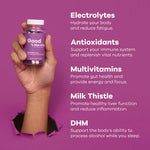 Our pharmacist-developed blend of electrolytes, milk thistle, DHM, and multivitamins offers hangover relief by hydrating, refueling, and detoxing your body after a night of drinking.