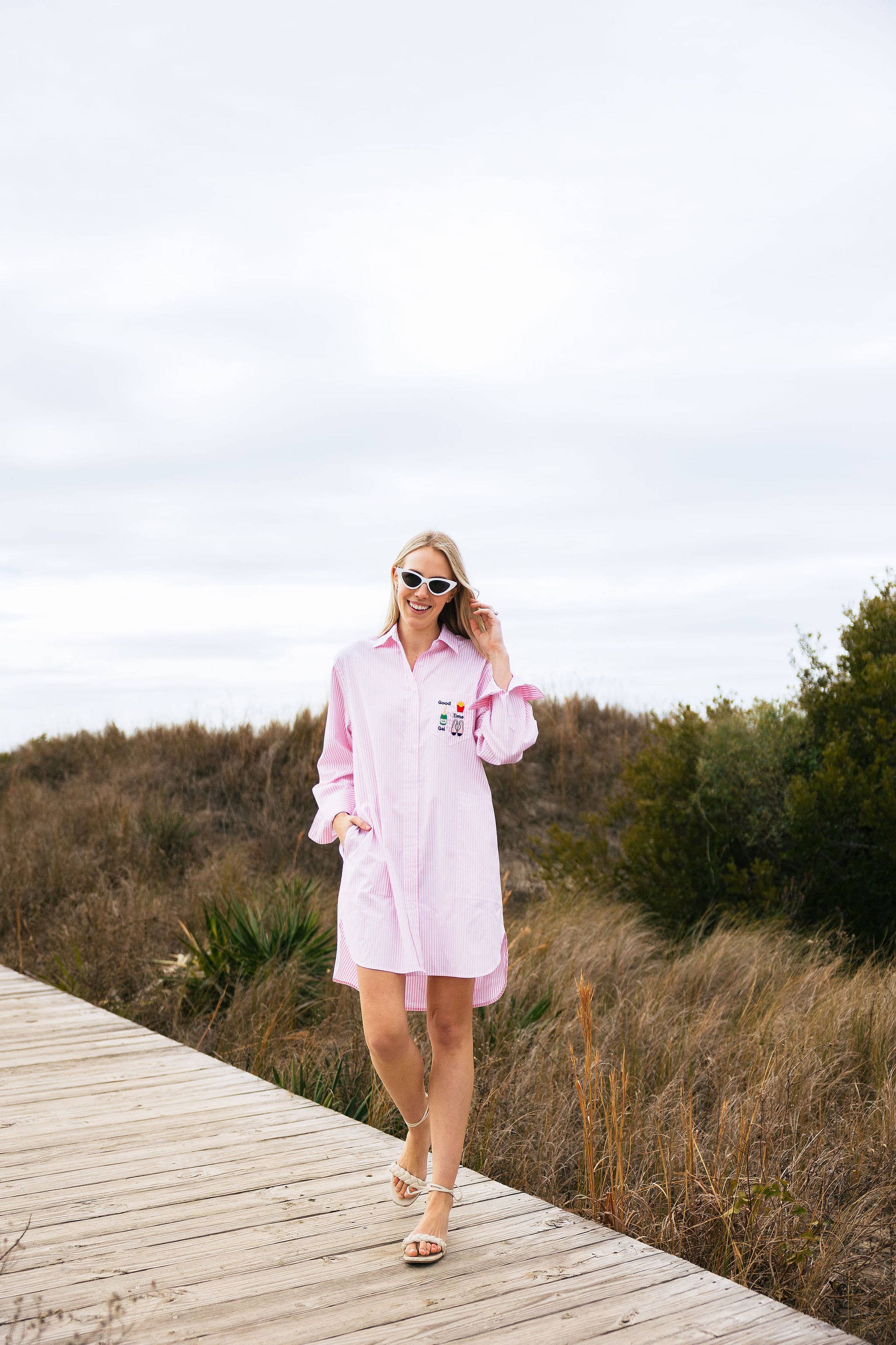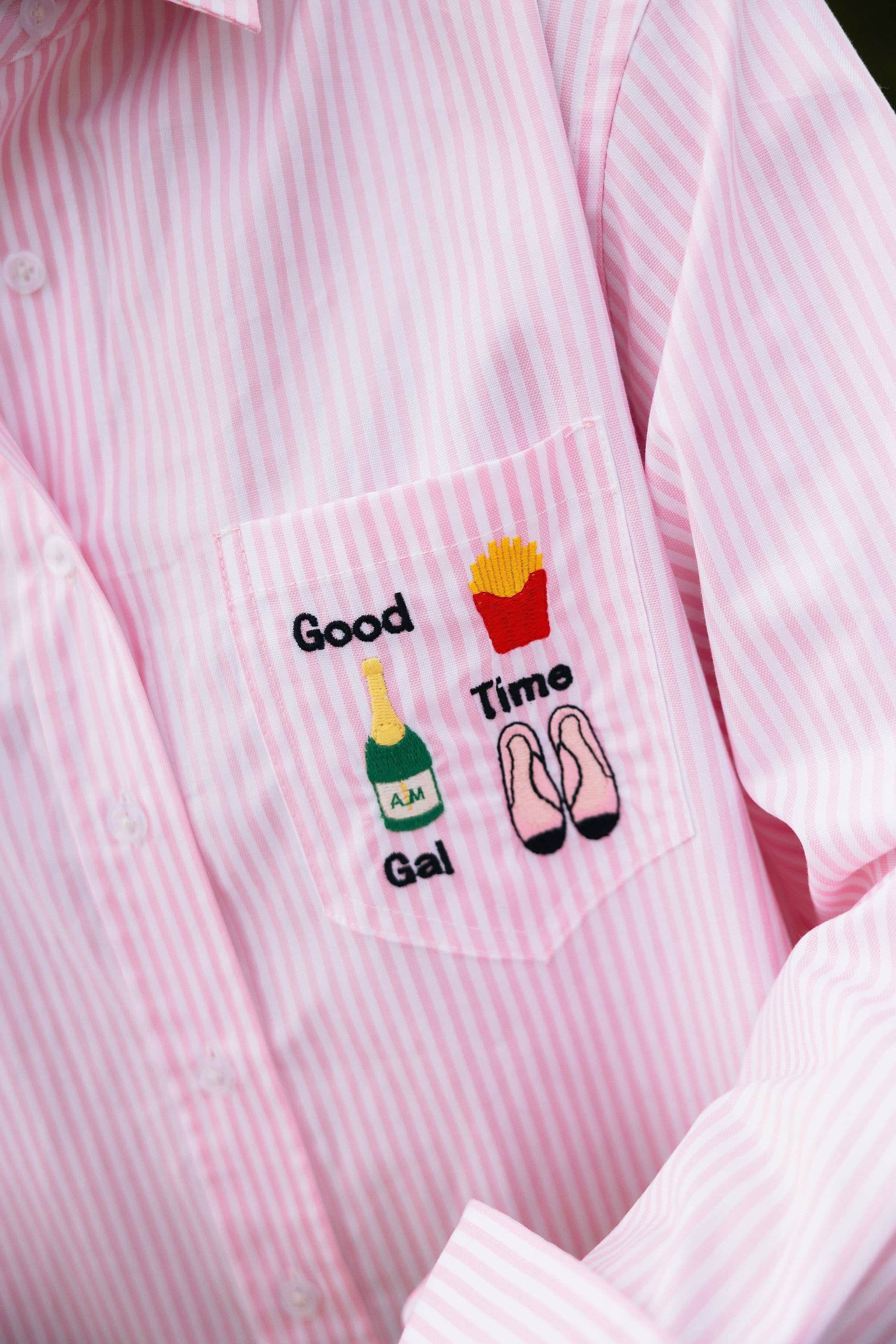 Classic long sleeve shirtdress with a relaxed fit, side entry patch pockets and above the knee length shirttail hem. Features "Good Time Gal" embroidery at front chest pocket for loads of fun. Fit runs LARGE! Size down!