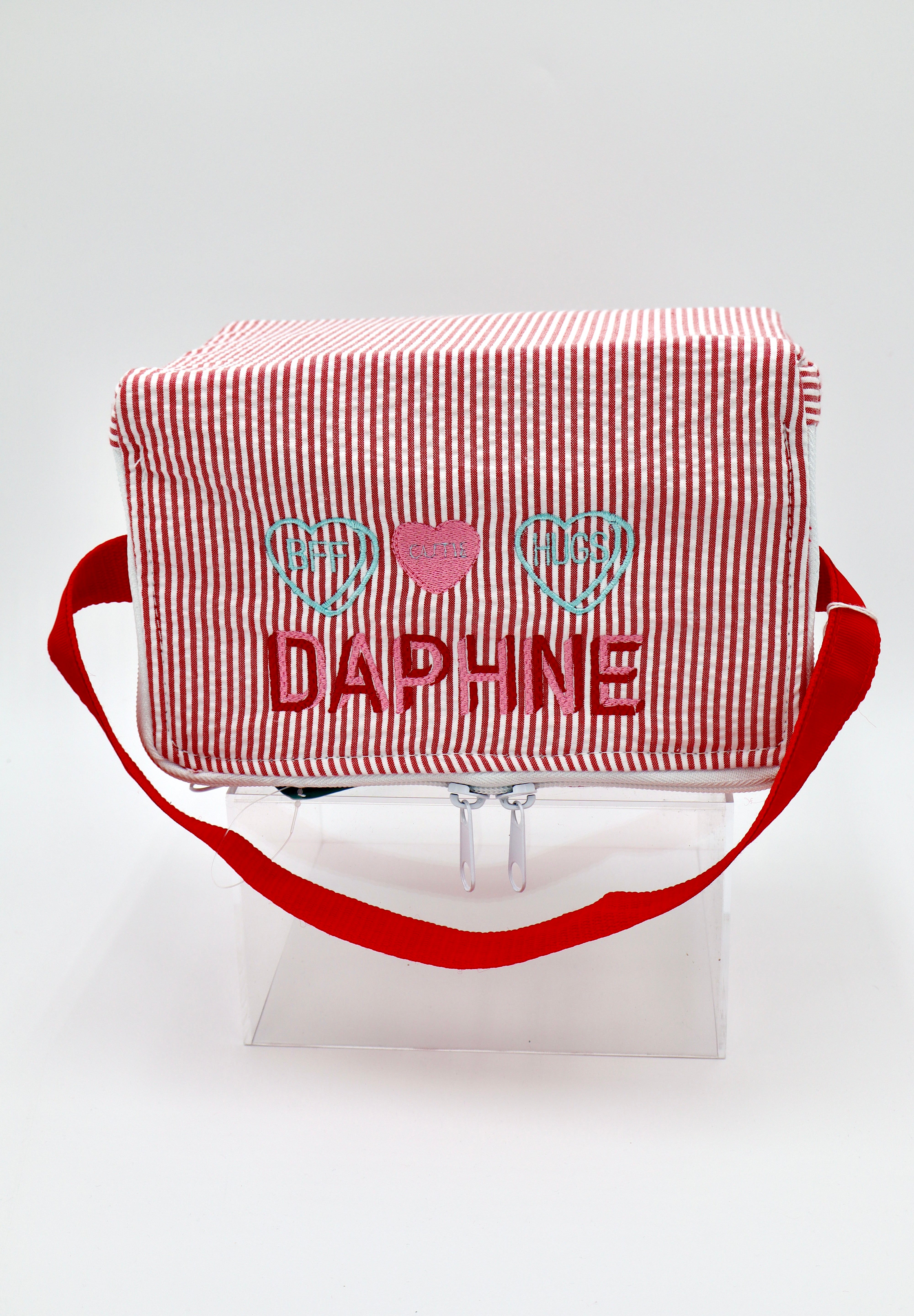 So cute, even last night's leftovers looks good in it. Front zippered pocket for a spork or a love note from Mom and fits most BENTO-style lunch ware! Add a giant monogram on the top for a personal touch!