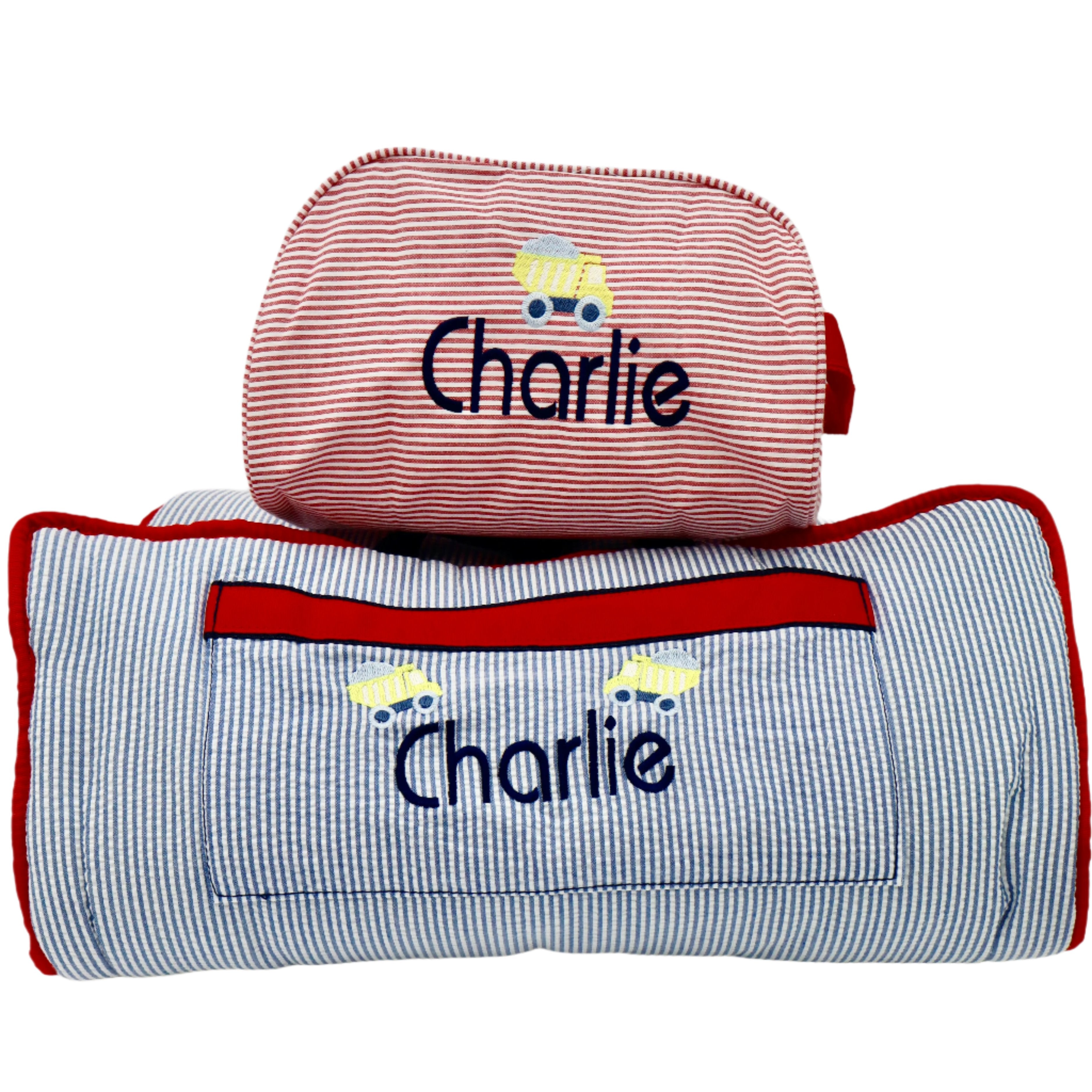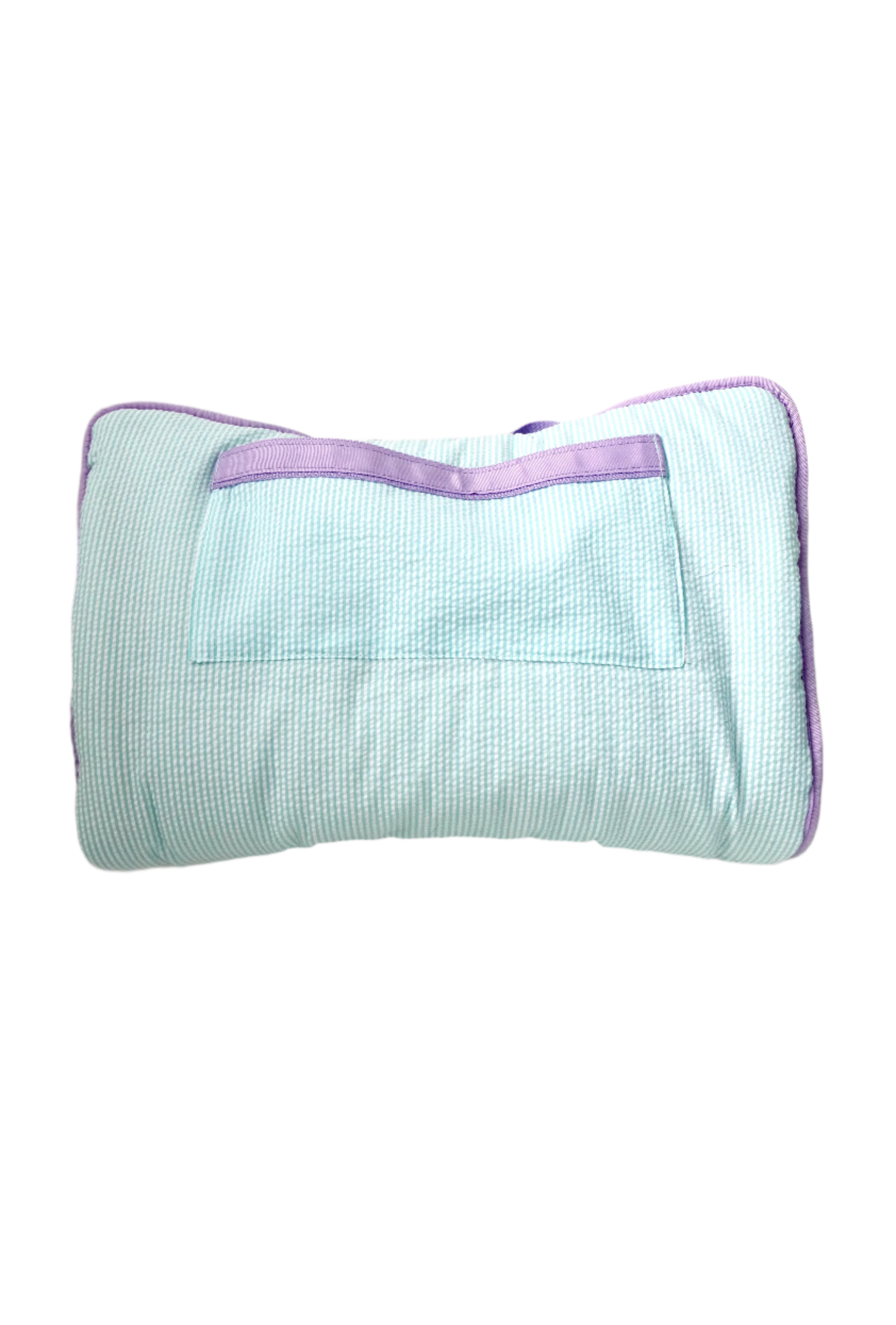 Padded and lined with nylon and cotton with a ribbon-trimmed, fleecy blanket. Easily rolls up and can be carried by the toddling toddlers on their way to Mother's Day Out, preschool, or to the corner for a time out. Easy to monogram on the outside pocket, the pillow, or anywhere on the blanket.