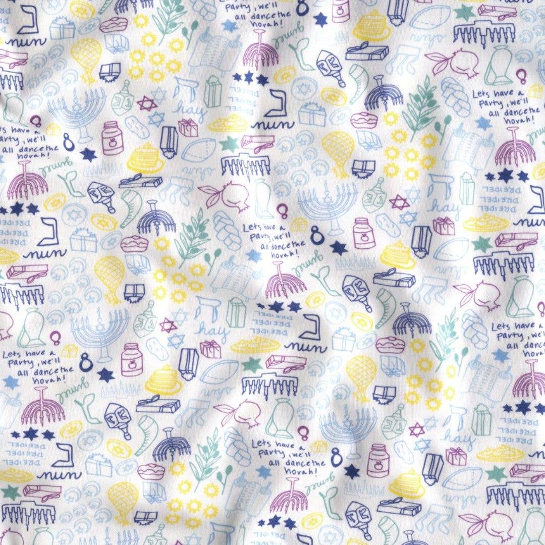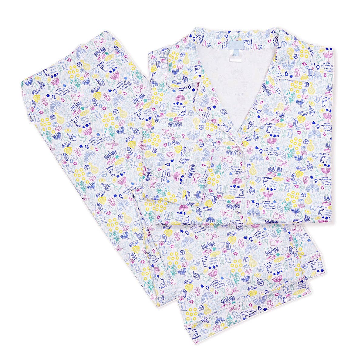 Our Hanukkah print pajamas feature all of your favorite Hanukkah traditions and pastimes! From Gimmel to gelt and latkes and applesauce, these jammies will give you sweet dreams of dancing the horah for eight days and nights and beyond!