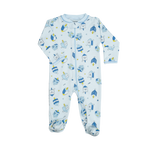 Make this Hanukkah ultra soft and special with our zipper footie in blue with dreidels to add a happy touch. Made of 100% Pima cotton, breathable and hypoallergenic. Machine wash cold, tumble dry. Snap Closure to keep zipper secure and sizes NB and 0-3 comes with mittens.