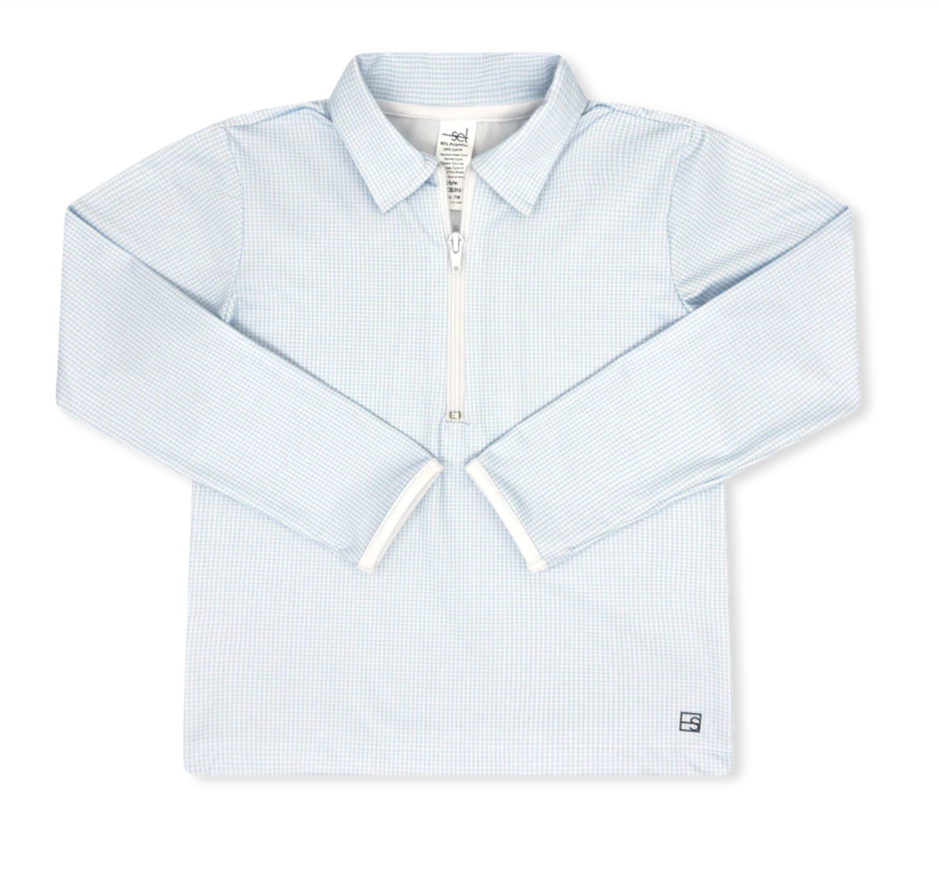 Our Henry Half Zip in? Cotton Candy Blue Minigingham?and Pure Coconut zipper is the perfect layering piece for cooler days!?From sports to comfy days at home, it'll be his?favorite to grab and go!