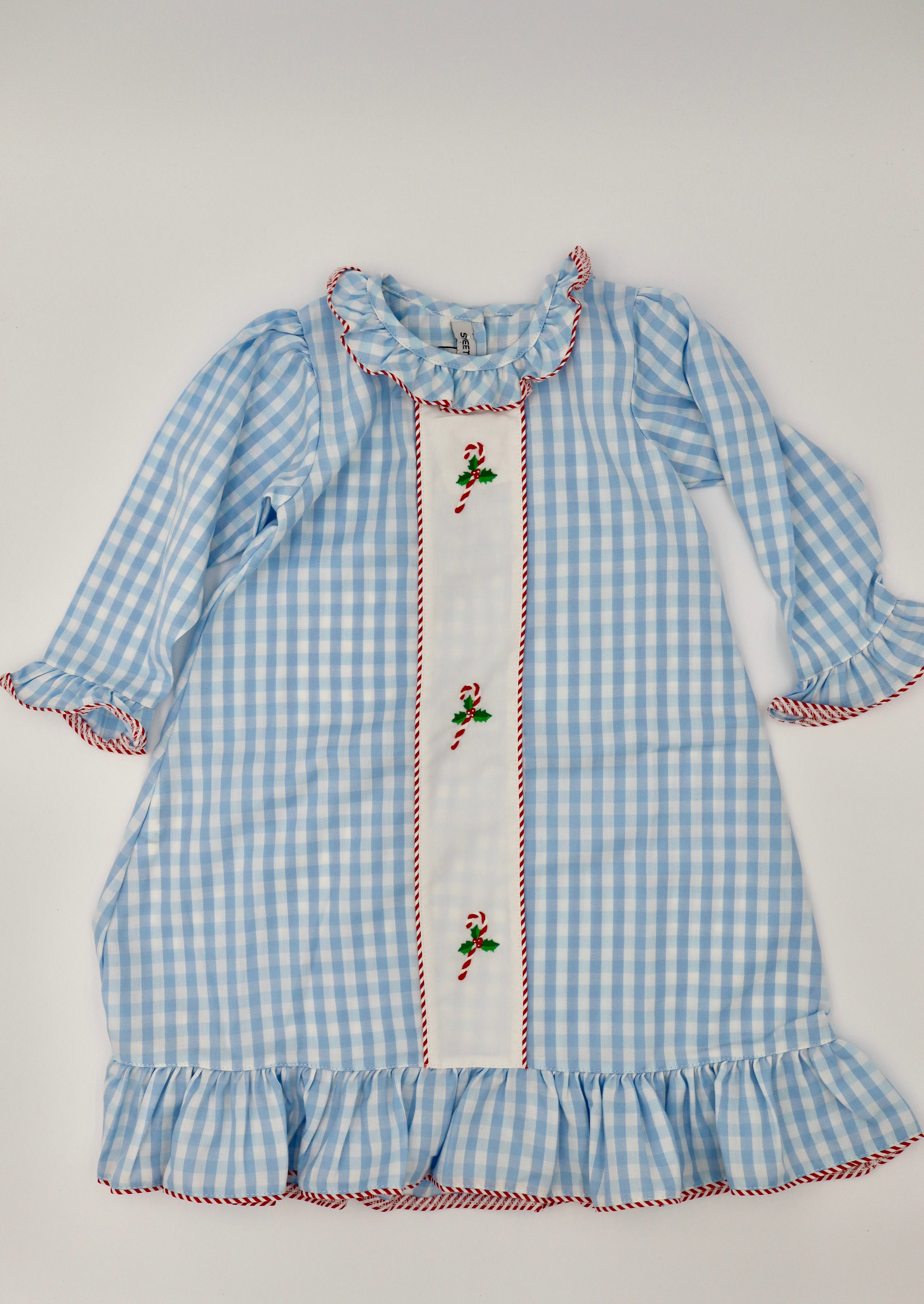 Celebrate the magic of the holidays with our Candy Cane Embroidered Blue Gingham Nightgown. This charming nightgown features festive embroidered candy canes, a ruffle collar, and long sleeves, perfect for cozy holiday nights.