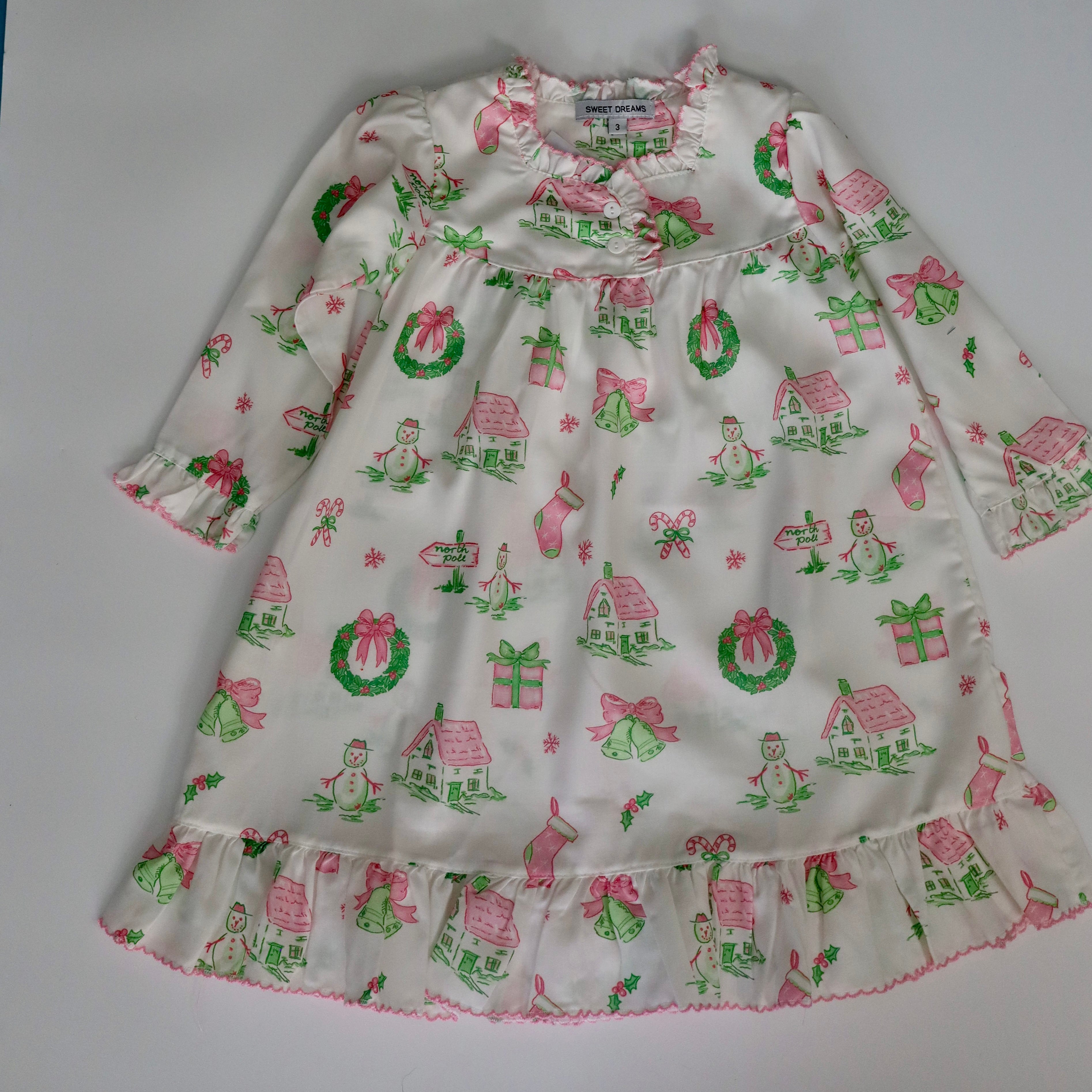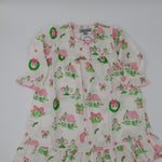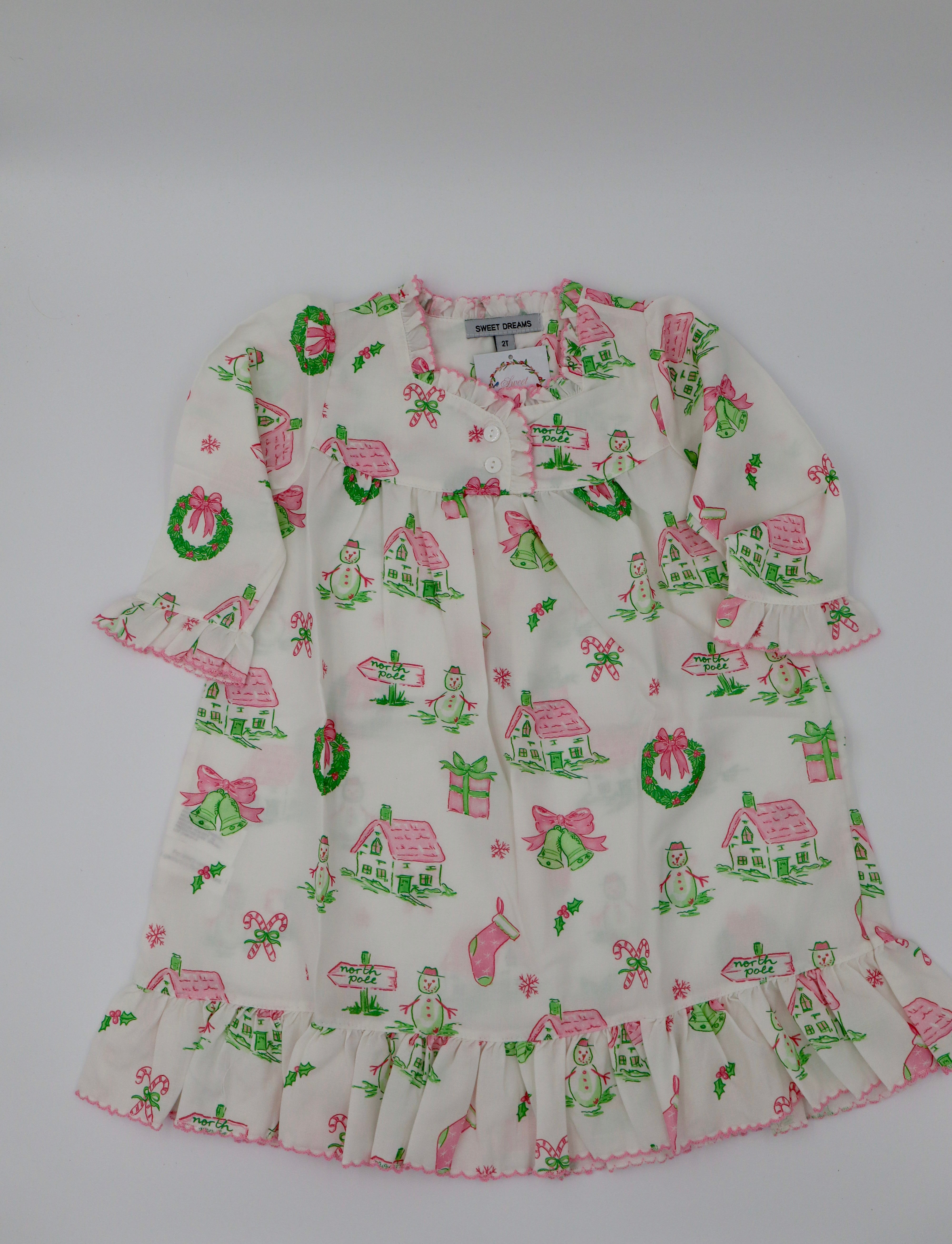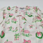 Celebrate the magic of Christmas morning in this Pink House Christmas Print Nightgown. This charming nightgown features ruffle details, front buttons, and a festive pink and green holiday print. Add a monogram for a personalized touch!