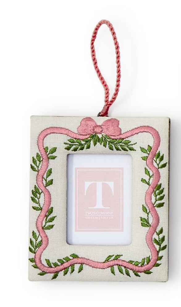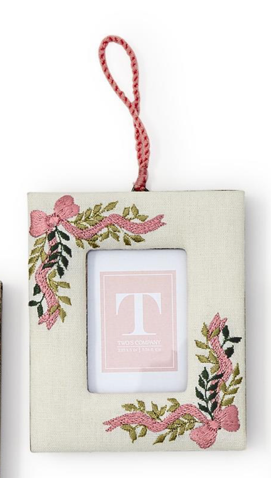 These charming hanging frames feature delicate embroidered details that add a festive and decorative touch to any space. Designed to showcase a small photo or keepsake, each frame is finished with a coordinating ribbon for easy hanging, making them a lovely addition to a tree, wreath, or wall display.