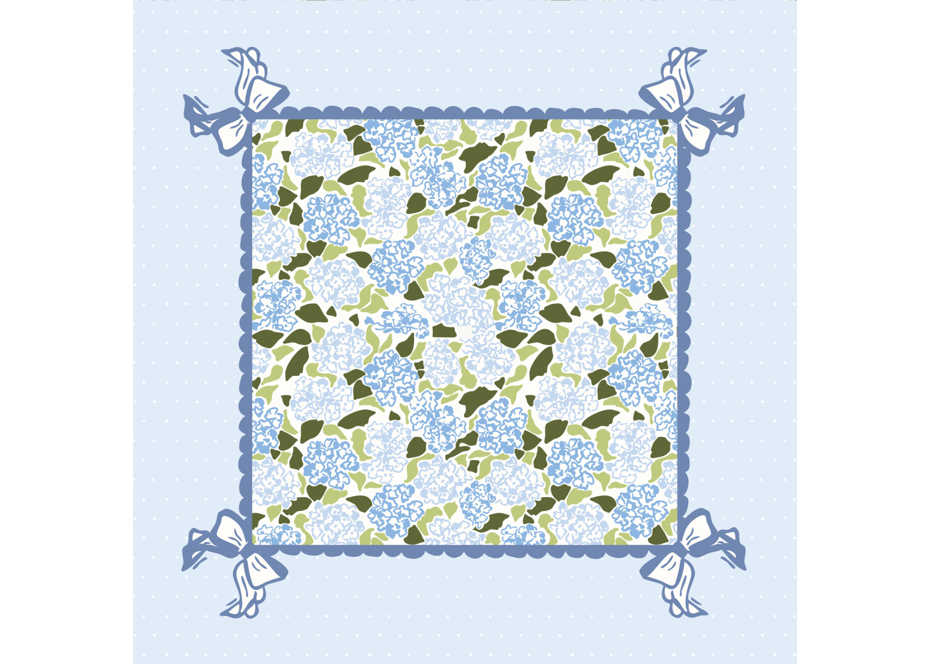 The Hydrangea Mat is a soft, feminine pairing for your Miss Darling Mahjong Tile Set, featuring a hand-drawn scalloped border, subtle polka dot detailing around the edge, and a watercolor-style hydrangea bloom at center. Each corner is finished with a charming bow, tying the whole look together... literally. Now made from 100% natural rubber, it’s more durable and flexible than neoprene. If minor creases appear, just lay it flat for a day or two and they’ll release easily. The non-slip backing keeps everything in place through every Charleston and self-pick. Natural rubber is also renewable, biodegradable, and produced with fewer toxins and lower emissions than petroleum-based neoprene, making it a smarter choice for your table and the planet. 34" square.