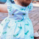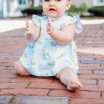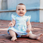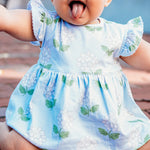 This hydrangea pima baby girls dress is perfect for spring and summer days! Dress includes built in onesie for diaper coverage! There is a matching 2T-8 Year Hydrangea dress to match big sister.