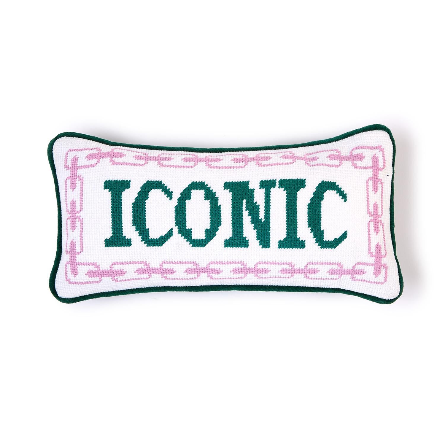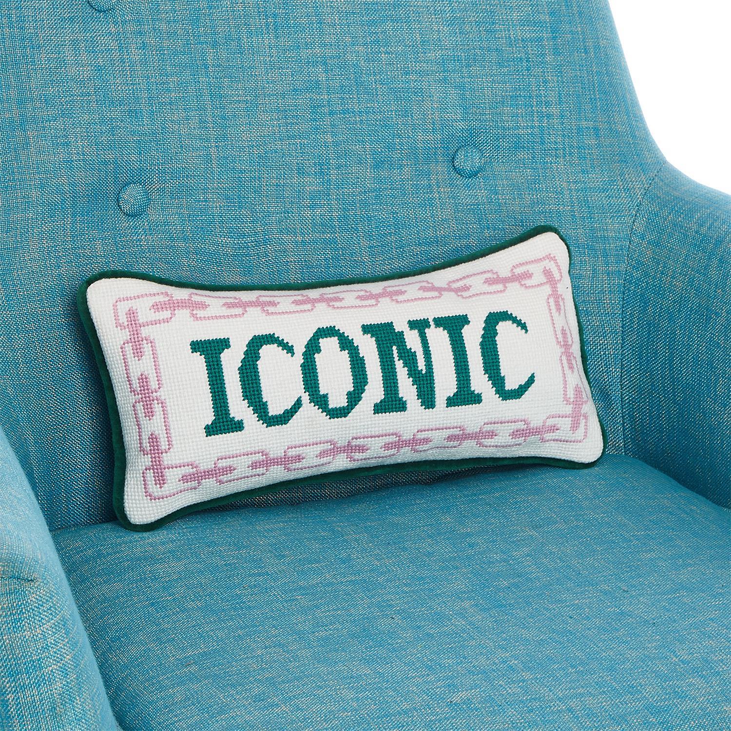 Show off your style with the bold and confident Iconic Needlepoint Pillow. Featuring striking needlepoint text, accented with soft velvet piping, and filled with plush PP filling, it's designed to make a statement. Its sleek rectangular shape adds a modern touch to any sofa, chair, or bed.