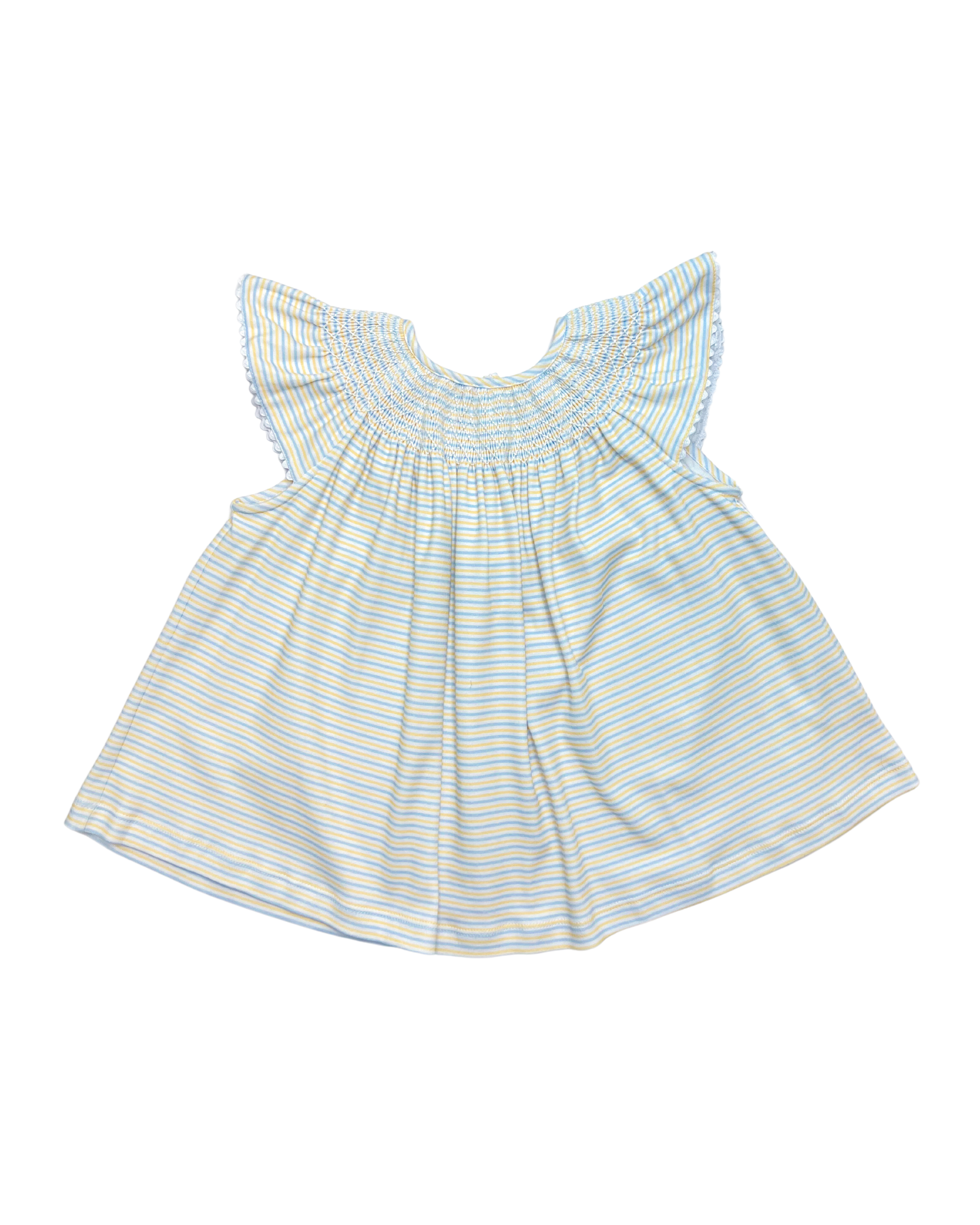 This top takes a boring basic and makes it fun. With flare sleeves and a crotched design, it's the perfect combo of trendy and stylish. Plus, the baby blue and butter stripe colors make it a versatile piece that goes with any bottoms - shorts, jeans, or leggings!