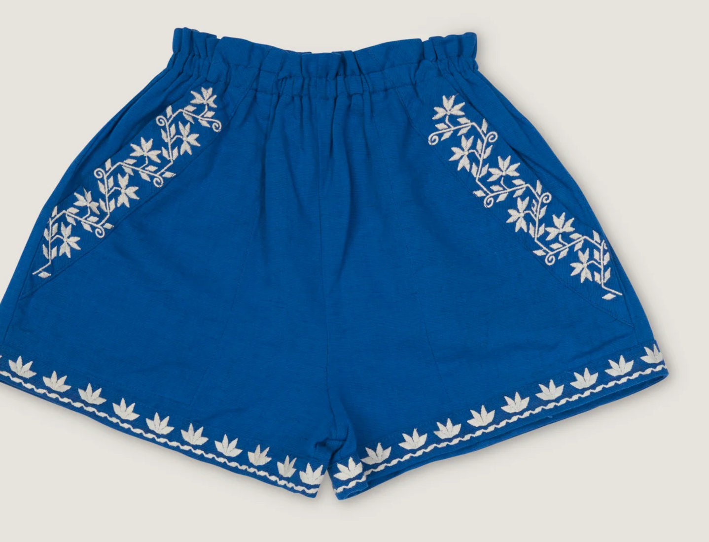 Meet the Paperbag Shorts in Aegean Blue, crafted from a medium-weight linen-cotton blend for the perfect balance of comfort and style. Featuring delicate embroidery at the hem and pockets, these shorts have a softly gathered, elasticated waistband for easy dressing. A warm-weather staple, they pair beautifully with our Luna Top and Moss Cardigans for effortless everyday charm.