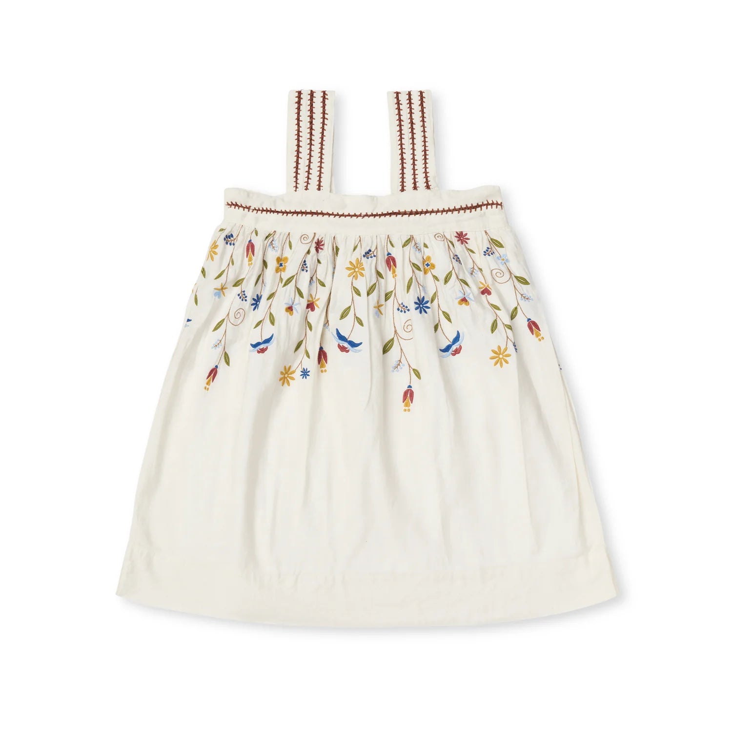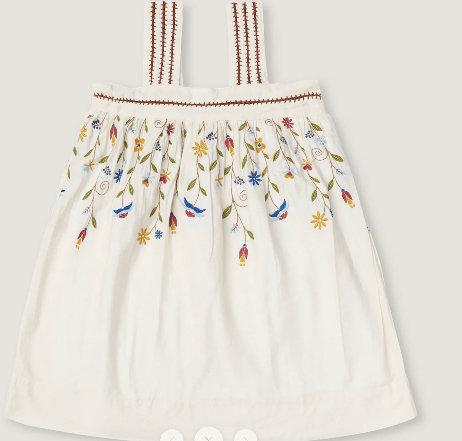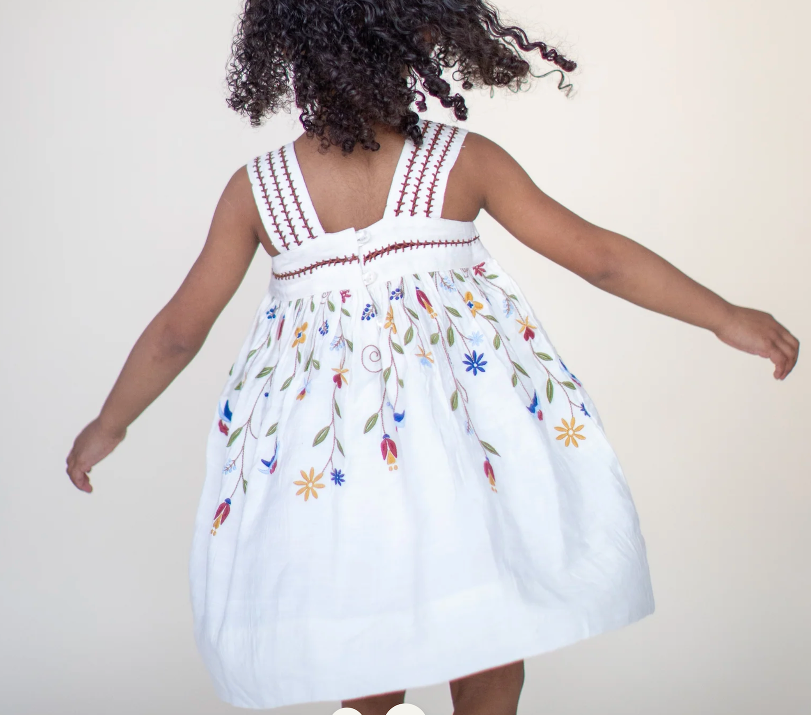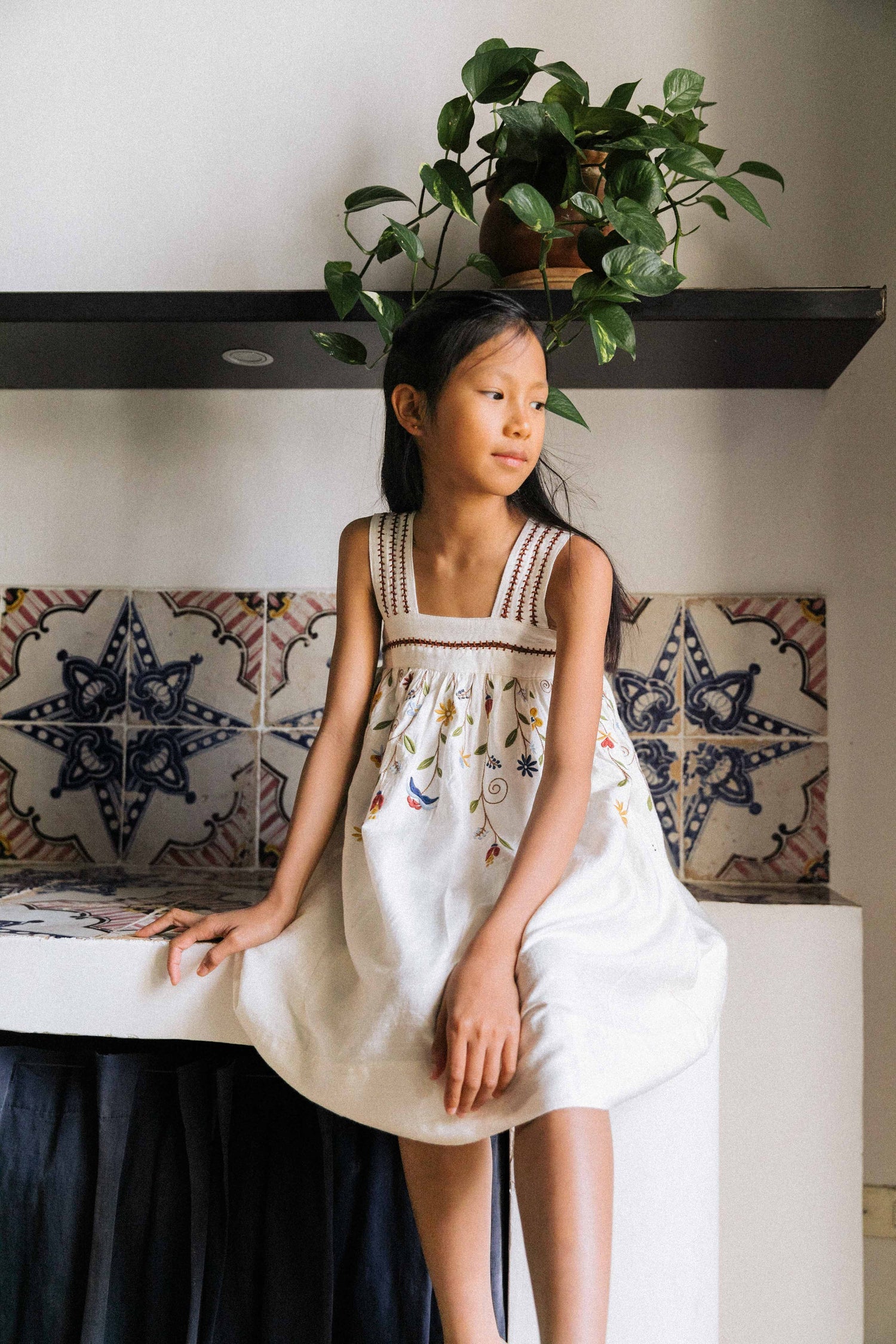 Introducing the Siena Dress in Opaline Silk, a timeless heirloom piece made to be cherished for generations. Crafted from hand-loomed 100% silk, it features delicate embroidered florals and intricate hand-faggoting along the straps and chest. Inspired by a dress Kinnari's made for her, Siena is perfect for spring celebrations, special memories, and meaningful milestones for years to come.