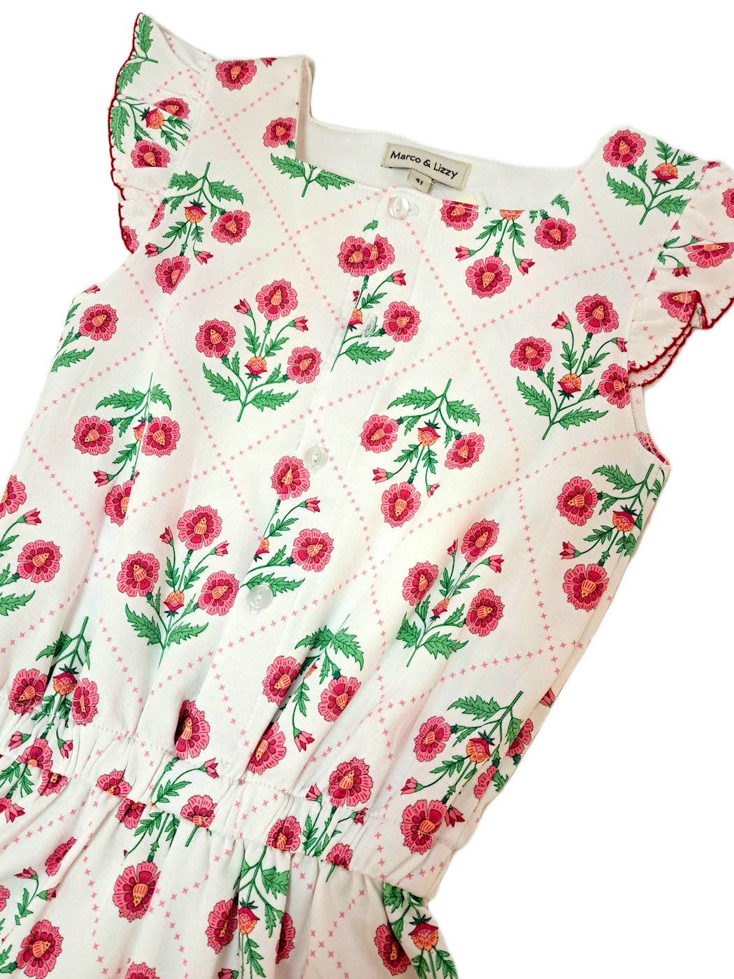 This sweet girls’ romper is crafted from luxurious, ultra-soft Pima cotton, offering exceptional comfort and breathability for warm-weather days. Designed in a delicate floral print with soft fuchsia tones, it features charming flutter sleeves and a gently elasticized waist for an easy, comfortable fit. Thoughtful details and a timeless silhouette make this romper perfect for everyday wear, special outings, and picture-perfect moments all season long.