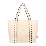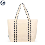 The Nantucket Beach Tote is stylish and functional, made from durable canvas with elegant scalloped edging. With spacious interior pockets, it keeps your beach essentials organized and within reach all day long.