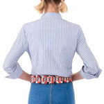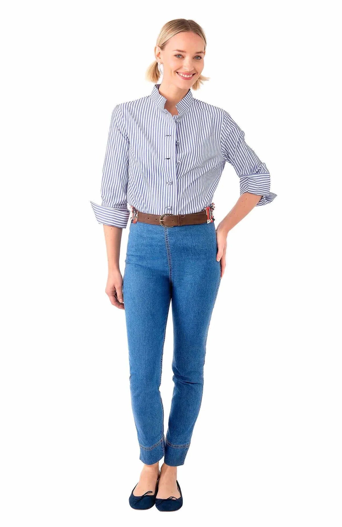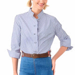 Effortlessly charming and endlessly versatile, this striped button-down top is a fresh twist on a classic. Designed with a modern stand collar, delicate button detailing, and subtle seam accents that flatter the silhouette, it’s the perfect blend of tailored and relaxed. The roll-tab sleeves add an easygoing touch, making it just as ideal for casual days as it is for dressed-up moments. Pair it with jeans, trousers, or skirts for a look that’s crisp, confident, and timeless.