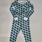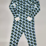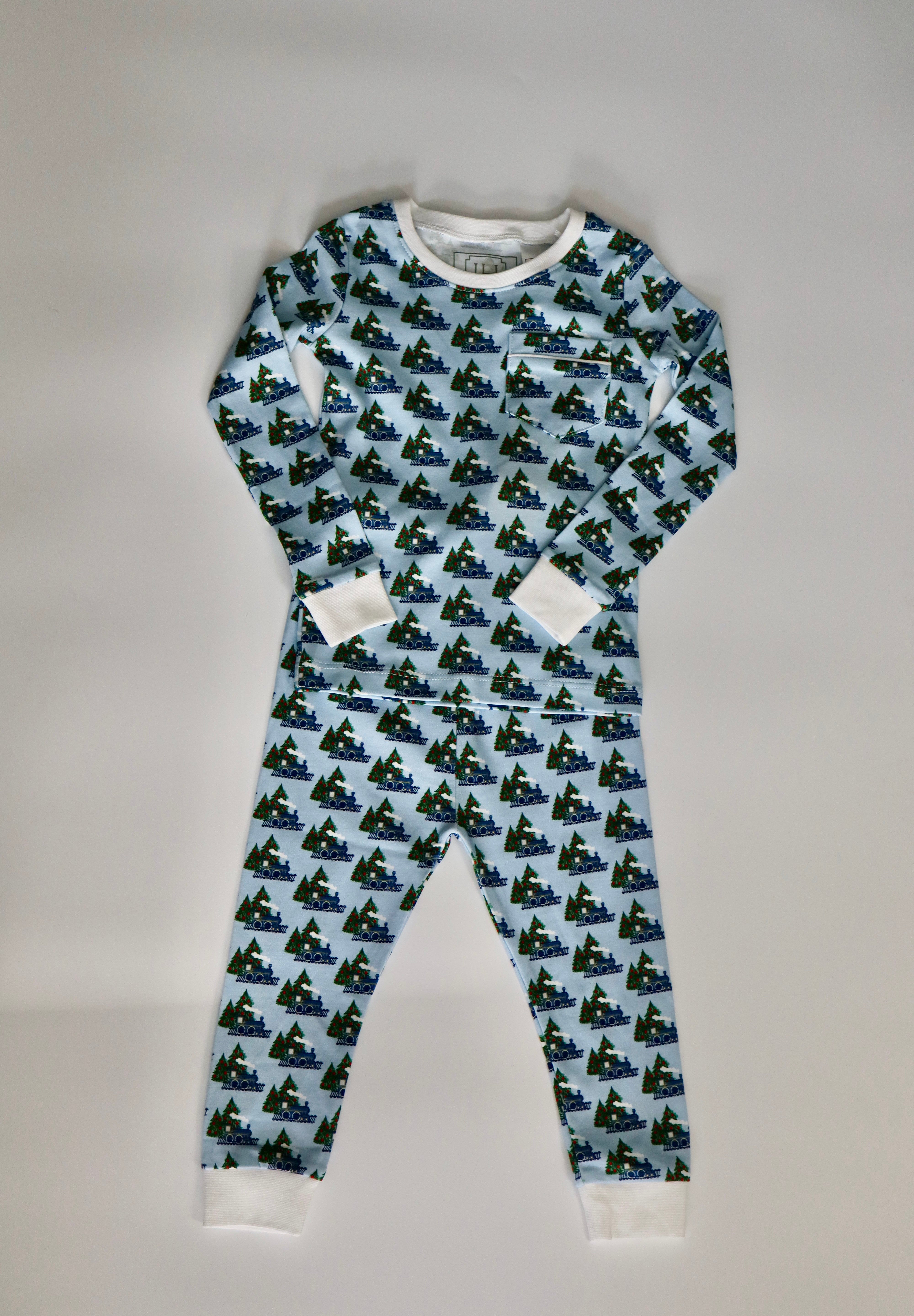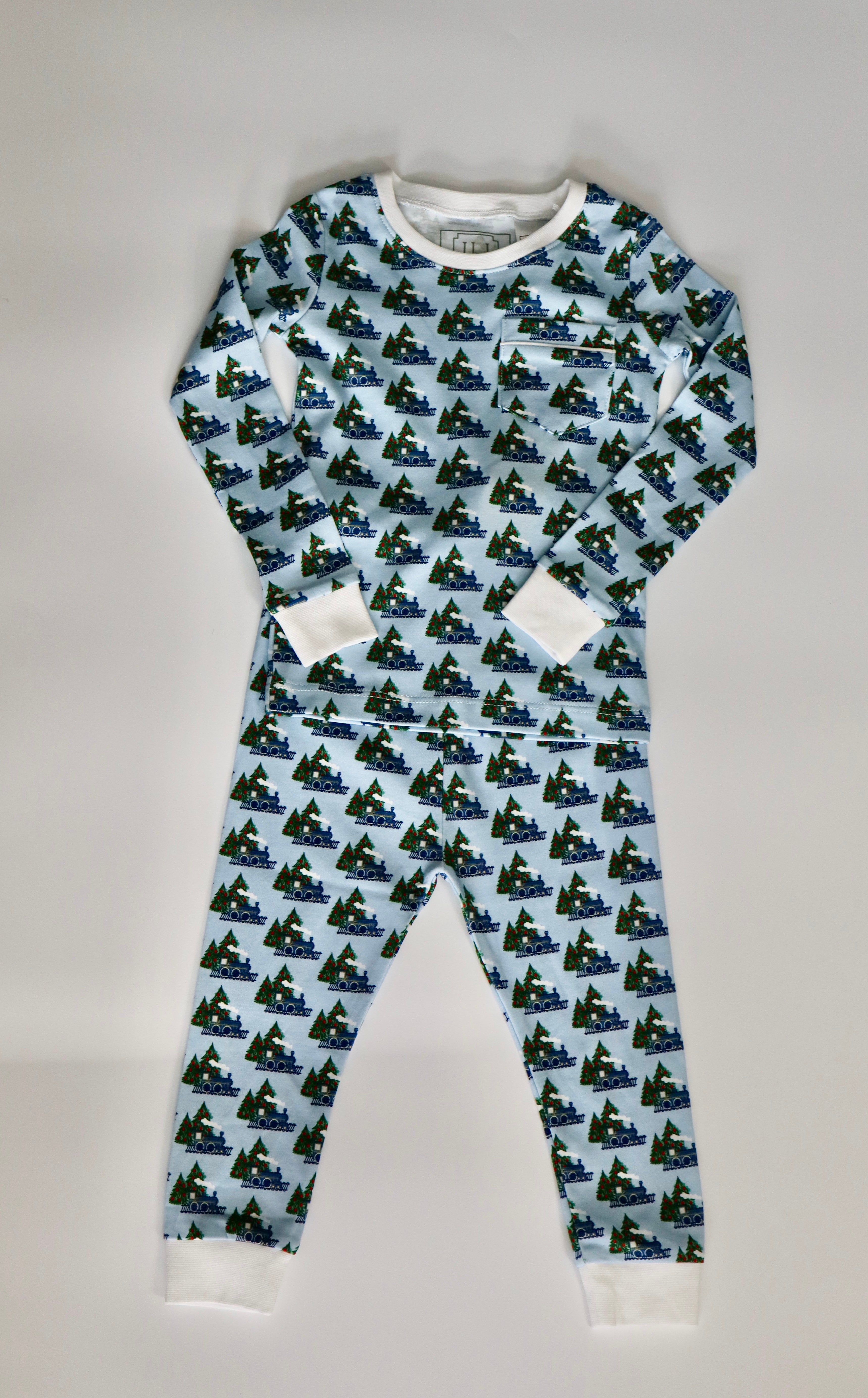 Pima cotton long sleeved pajama top and pant set. Pants have an elastic waistband and the long sleeved top has a pocket with white piping.