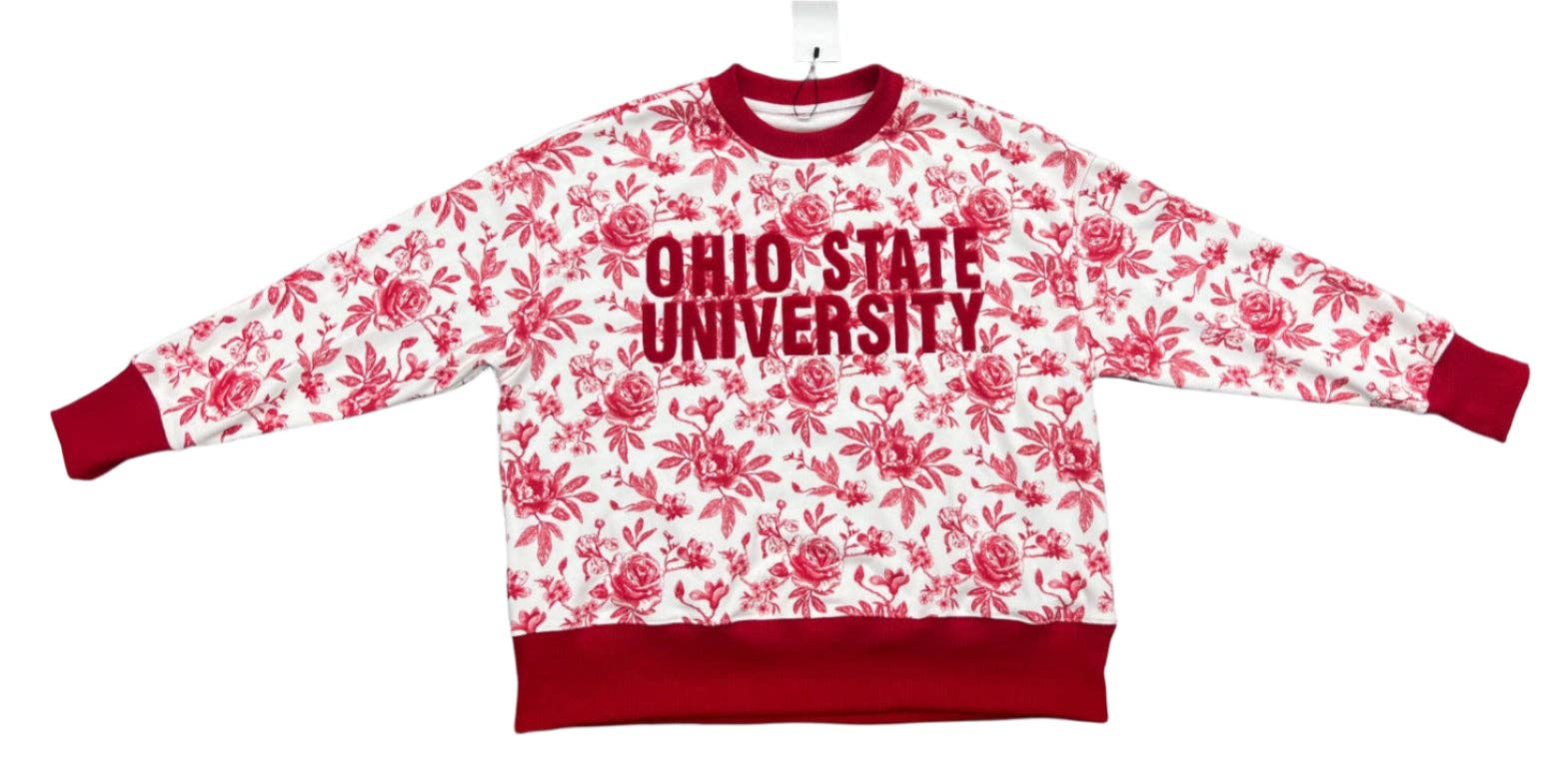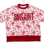 Get ready to cheer in style with this officially licensed collegiate sweatshirt! This cozy, oversized cotton piece sports a charming floral toile pattern in your team’s colors, adding a fun twist to your gameday outfit. Featuring fuzzy chenille university lettering outlined in embroidery, it’s the perfect playful way to show your spirit.