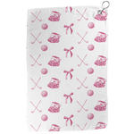 Introducing our Coquette Golf Towel, the perfect accessory to add a touch of charm to your golfing ensemble. Designed with the stylish golfer in mind, this towel is not only functional but also incredibly cute, featuring a delightful pink bow golf pattern.