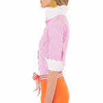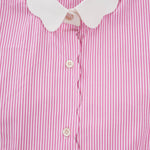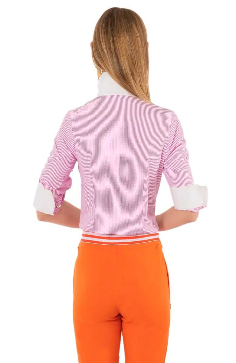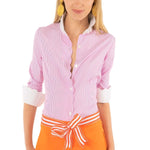 Bright, playful, and effortlessly chic, this pink striped button-down top adds a pop of charm to any outfit. Designed with a crisp contrast collar, delicate vertical stripes, and a flattering relaxed fit, it strikes the perfect balance between polished and fun. The roll-up cuffs with contrast lining give it a laid-back feel, while the slightly open neckline adds a touch of feminine flair. Easy to dress up or down, this top is made for sunny days and confident styling.