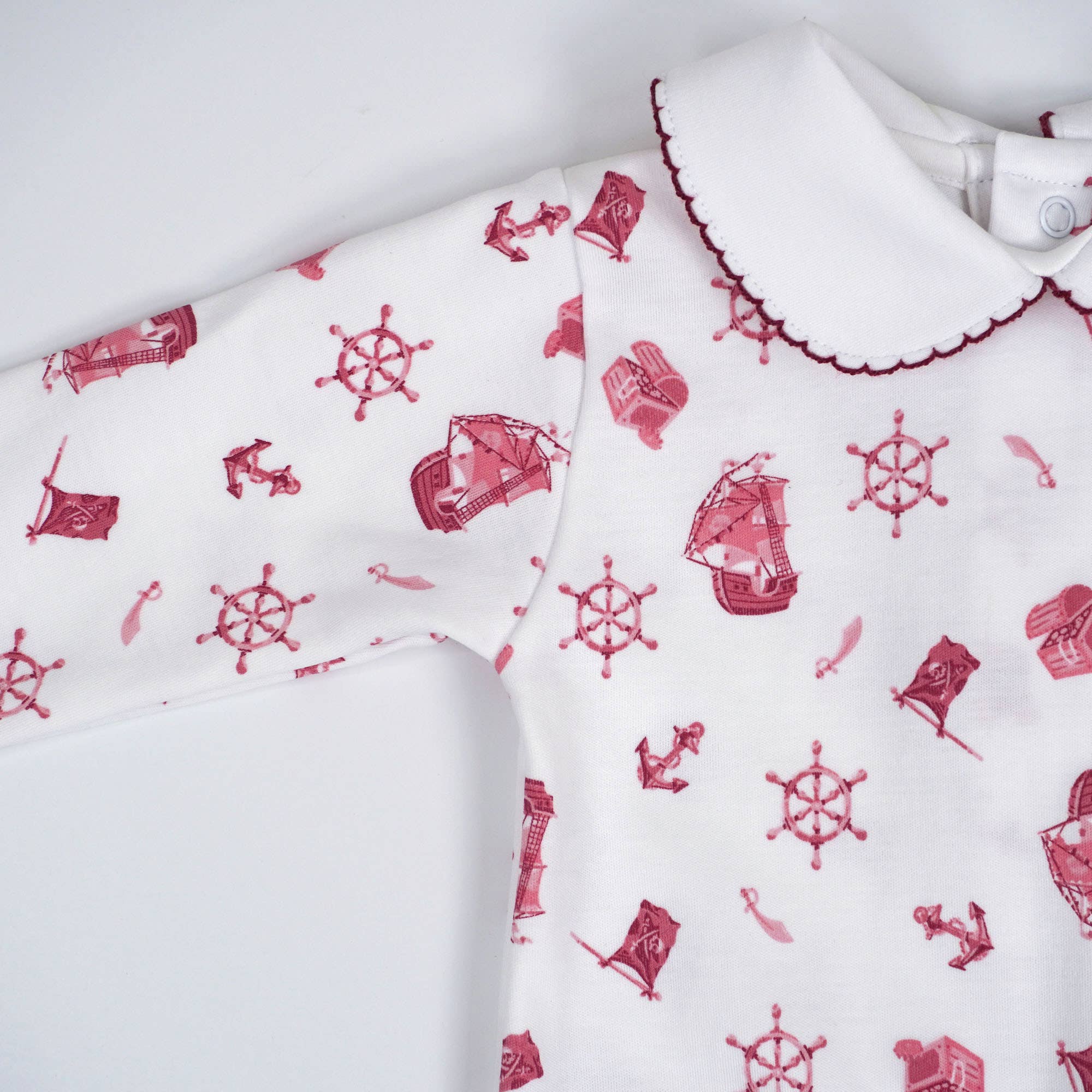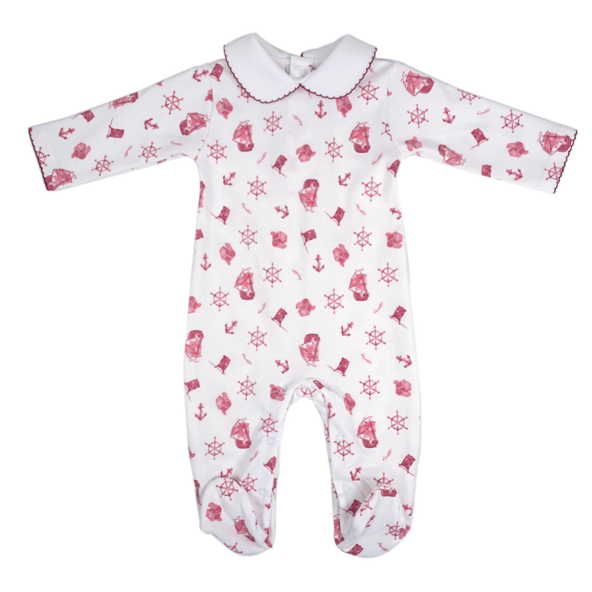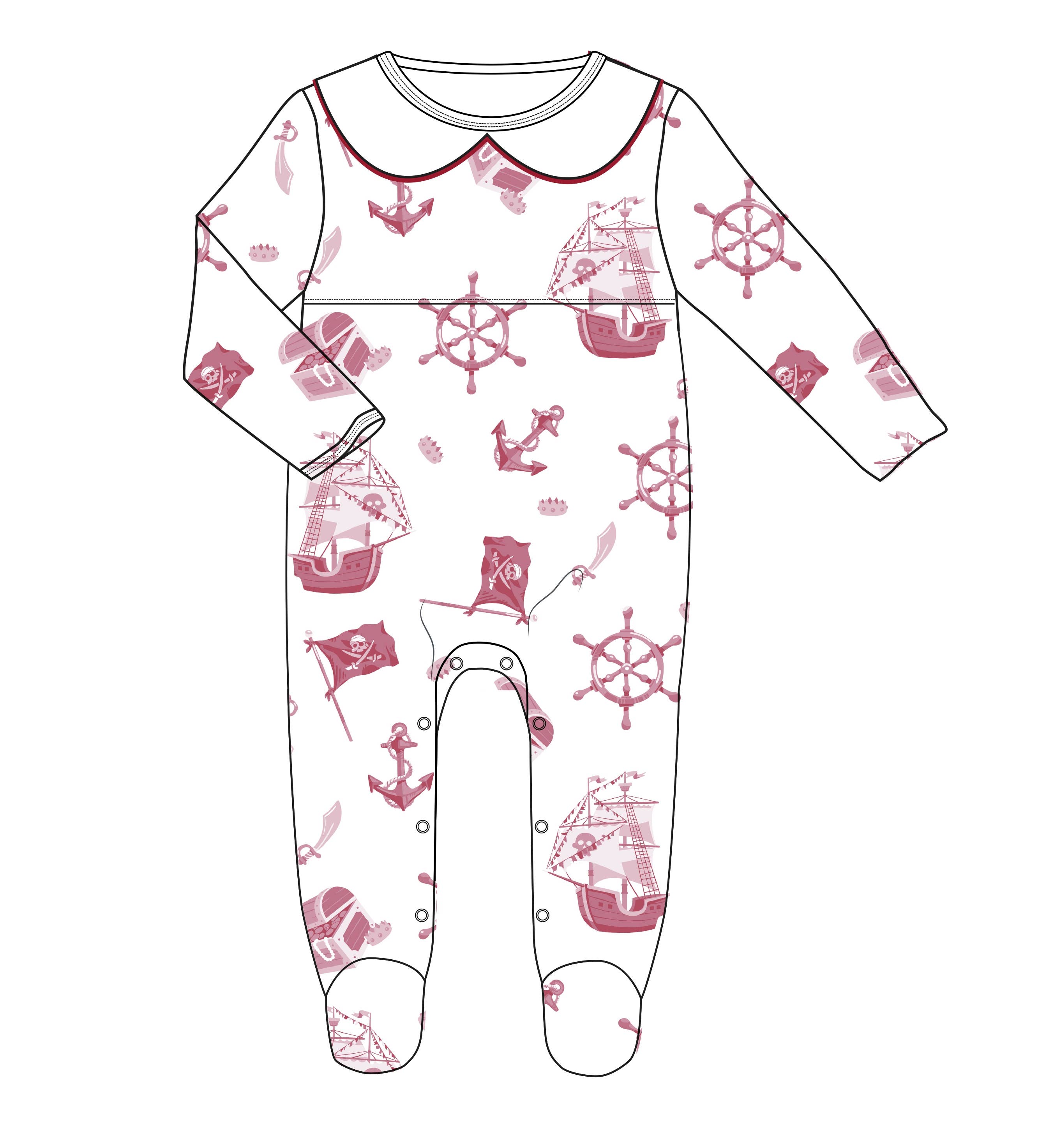 Ahoy, Mateys! Set Sail for Dreamland in These Pirate Footie Pajamas Little buccaneers will love to drift off to dreamland in these adorable pirate footie pajamas! Made from 100% pima cotton, these pajamas are soft and gentle on your baby's delicate skin. The lined peter pan collar adds a touch of elegance, while the all-over pirate print adds a playful touch. These footie pajamas are sure to be a favorite for bedtime or playtime.