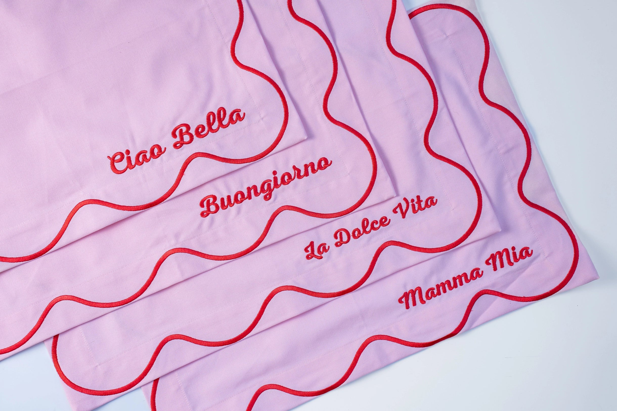Placemats as chic as Nonna’s wardrobe embroidered with whimsical waves and crafted from luxurious fabric, just like fine linens made in Italy.