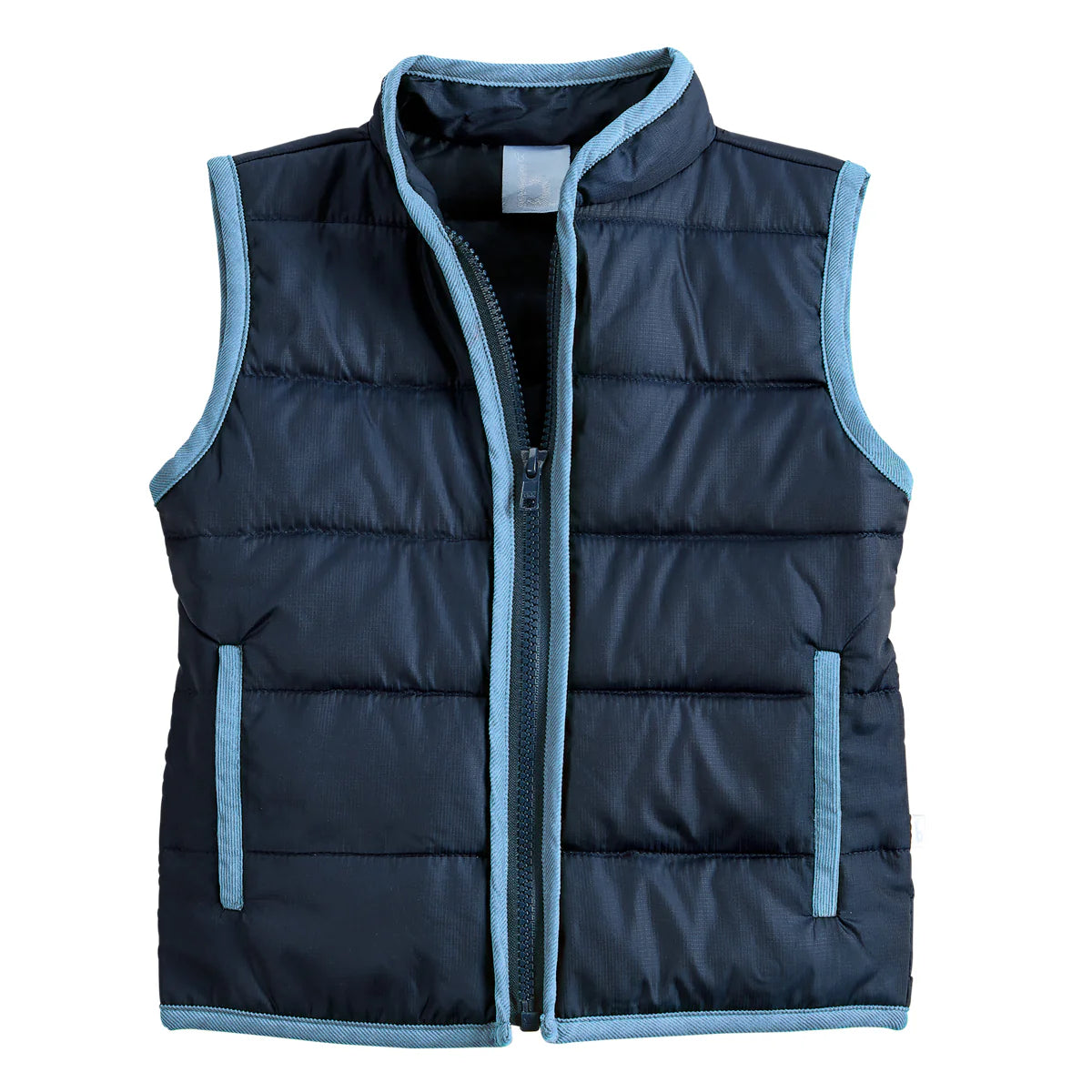 Navy puffer with light blue trim. Our take on the classic vest features soft textures and contrasting trim. The perfect layer for those cooler mornings. 100% poly; machine washable.